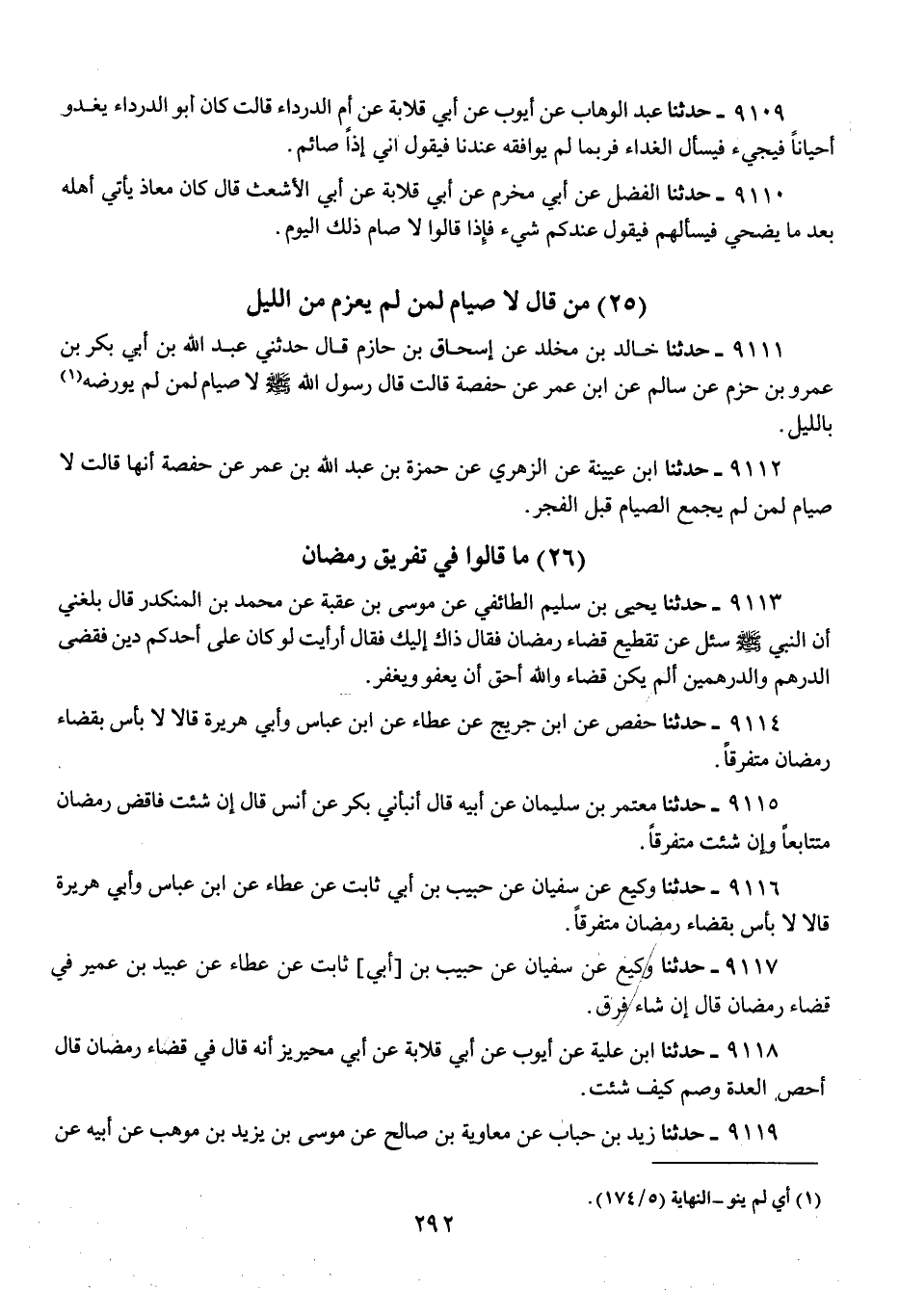 9111 - حَدَّثَنَا خَالِدُ بْنُ مَخْلَدٍ، عَنْ إِسْحَاقَ بْنِ حَازِمٍ، قَالَ: حَدَّثَنِي عَبْدُ اللَّهِ بْنُ أَبِي بَكْرِ بْنِ عَمْرِو بْنِ حَزْمٍ، عَنْ سَالِمٍ، عَنِ ابْنِ عُمَرَ، عَنْ حَفْصَةَ، قَالَتْ: قَالَ رَسُولُ اللَّهِ صَلَّى اللهُ عَلَيْهِ وَسَلَّمَ: «§لَا صِيَامَ لِمَنْ لَمْ يَفْرِضْهُ بِاللَّيْلِ»