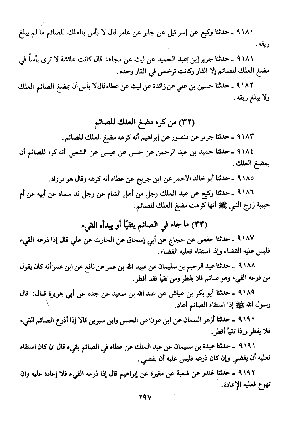 9181 - حَدَّثَنَا جَرِيرُ بْنُ عَبْدِ الْحَمِيدِ، عَنْ لَيْثٍ، عَنْ مُجَاهِدٍ، قَالَ: «كَانَتْ عَائِشَةُ، §لَا تَرَى بَأْسًا فِي مَضْغِ الْعِلْكِ لِلصَّائِمِ، إِلَّا الْقَارَ، وَكَانَتْ تُرَخِّصُ فِي الْقَارِ وَحْدَهُ»