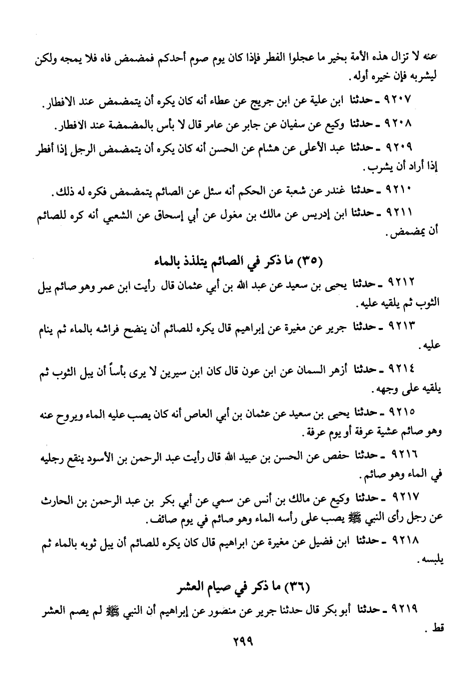 9213 - حَدَّثَنَا جَرِيرٌ، عَنْ مُغِيرَةَ، عَنْ إِبْرَاهِيمَ، قَالَ: «§يُكْرَهُ لِلصَّائِمِ أَنْ يَنْضَحَ فِرَاشَهُ بِالْمَاءِ، ثُمَّ يَنَامَ عَلَيْهِ»