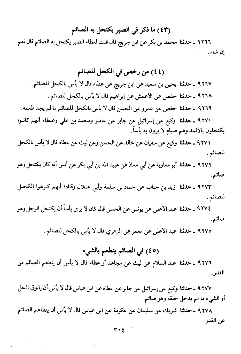 9267 - حَدَّثَنَا يَحْيَى بْنُ سَعِيدٍ، عَنِ ابْنِ جُرَيْجٍ، عَنْ عَطَاءٍ، قَالَ: «§لَا بَأْسَ بِالْكُحْلِ لِلصَّائِمِ»