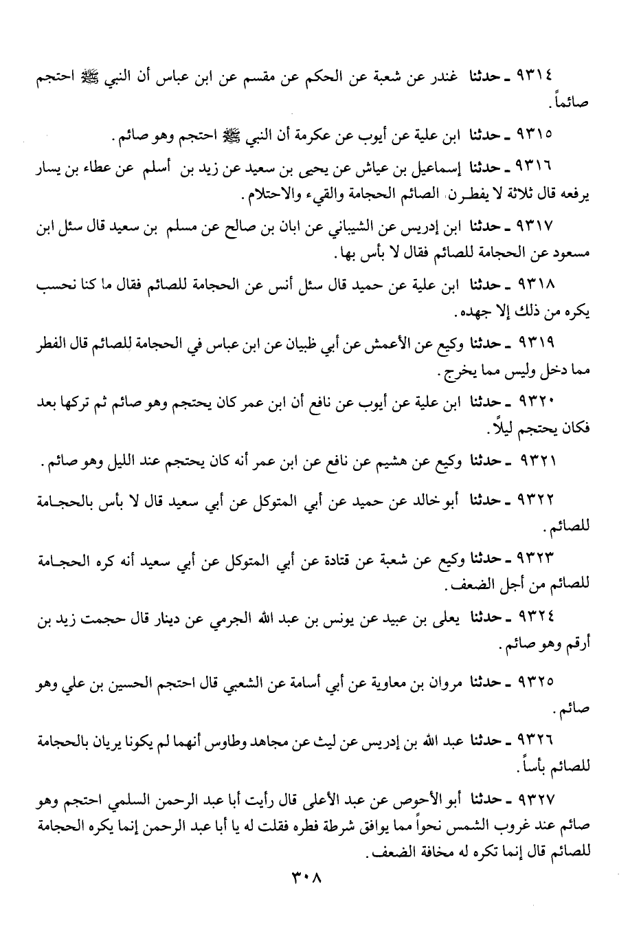 9320 - حَدَّثَنَا ابْنُ عُلَيَّةَ، عَنْ أَيُّوبَ، عَنْ نَافِعٍ، «أَنَّ ابْنَ عُمَرَ كَانَ §يَحْتَجِمُ وَهُوَ صَائِمٌ، ثُمَّ تَرَكَهَا بَعْدُ، فَكَانَ يَحْتَجِمُ لَيْلًا»