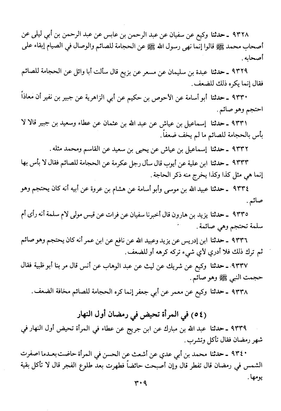 9334 - حَدَّثَنَا عُبَيْدُ اللَّهِ بْنُ مُوسَى، وَأَبُو أُسَامَةَ، عَنْ هِشَامٍ، عَنْ عُرْوَةَ، عَنْ أَبِيهِ، «أَنَّهُ كَانَ §يَحْتَجِمُ وَهُوَ صَائِمٌ»
