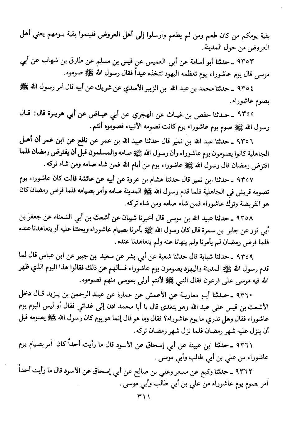 9353 - حَدَّثَنَا أَبُو أُسَامَةَ، عَنْ أَبِي الْعُمَيْسِ، عَنْ قَيْسِ بْنِ مُسْلِمٍ، عَنْ طَارِقِ بْنِ شِهَابٍ، عَنْ أَبِي مُوسَى، قَالَ: يَوْمُ عَاشُورَاءَ، يَوْمٌ تُعَظِّمُهُ الْيَهُودُ تَتَّخِذُهُ عِيدًا فَقَالَ رَسُولُ اللَّهِ صَلَّى اللهُ عَلَيْهِ وَسَلَّمَ: «§صُومُوهُ»