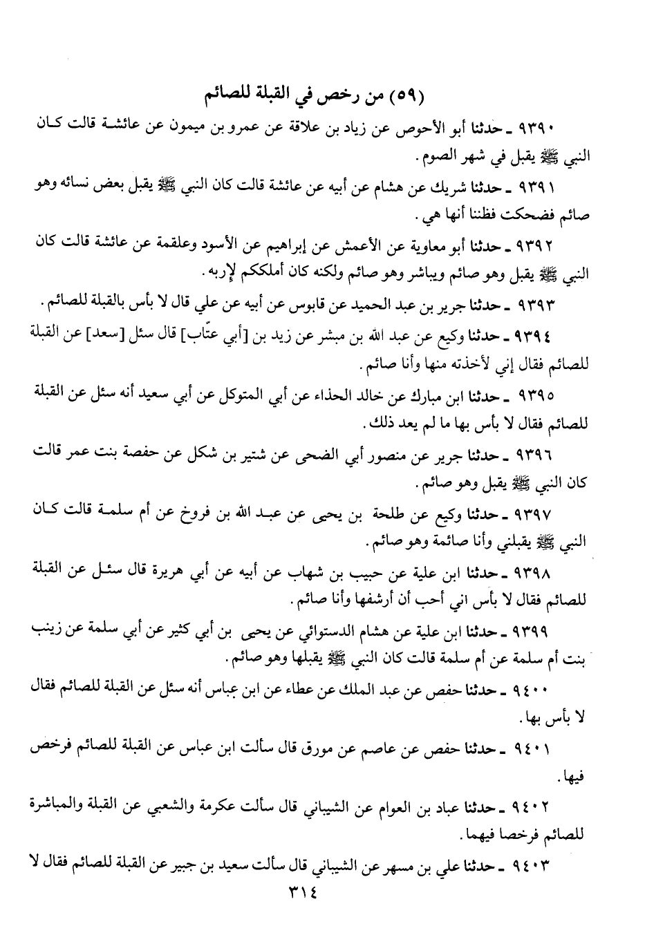 9390 - حَدَّثَنَا أَبُو الْأَحْوَصِ، عَنْ زِيَادِ بْنِ عِلَاقَةَ، عَنْ عَمْرِو بْنِ مَيْمُونٍ، عَنْ عَائِشَةَ، قَالَتْ: «كَانَ النَّبِيُّ صَلَّى اللهُ عَلَيْهِ وَسَلَّمَ §يُقَبِّلُ فِي شَهْرِ الصَّوْمِ»