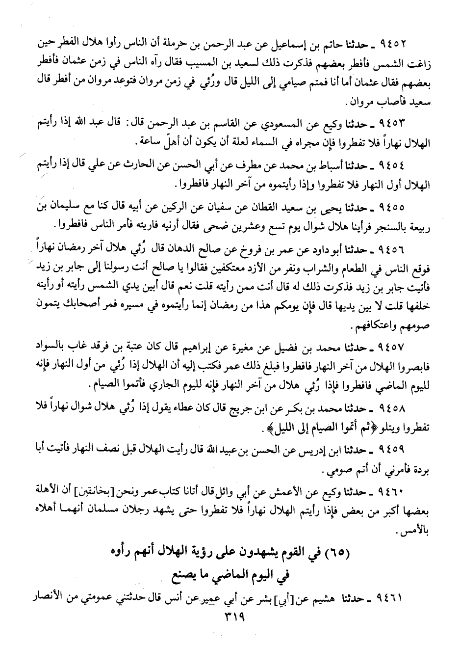 9453 - حَدَّثَنَا وَكِيعٌ، عَنِ الْمَسْعُودِيِّ، عَنِ الْقَاسِمِ بْنِ عَبْدِ الرَّحْمَنِ، قَالَ: قَالَ عَبْدُ اللَّهِ: «§إِذَا رَأَيْتُمُ الْهِلَالَ نَهَارًا فَلَا تُفْطِرُوا، فَإِنَّ مَجْرَاهُ فِي السَّمَاءِ لَعَلَّهُ أَنْ يَكُونَ أَنْ أَهَلَّ سَاعَةً»