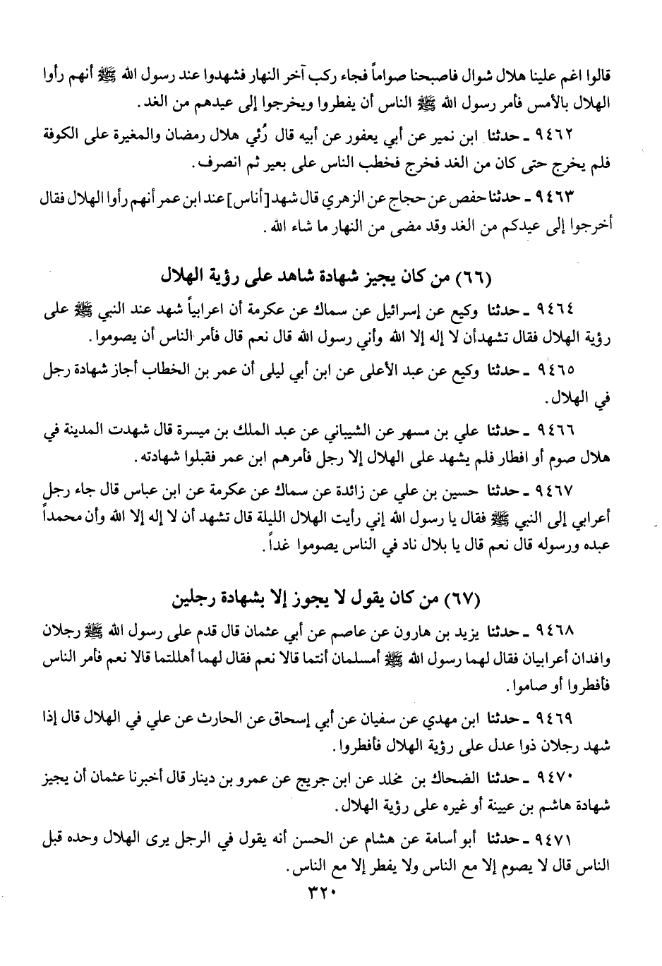 9464 - حَدَّثَنَا وَكِيعٌ، عَنْ إِسْرَائِيلَ، عَنْ سِمَاكٍ، عَنْ عِكْرِمَةَ، أَنَّ أَعْرَابِيًّا §شَهِدَ عِنْدَ النَّبِيِّ صَلَّى اللهُ عَلَيْهِ وَسَلَّمَ عَلَى رُؤْيَةِ الْهِلَالِ، فَقَالَ: «تَشْهَدُ أَنْ لَا إِلَهَ إِلَّا اللَّهُ وَأَنِّي رَسُولُ اللَّهِ؟» قَالَ: نَعَمْ، قَالَ: فَأْمُرِ النَّاسَ أَنْ يَصُومُوا