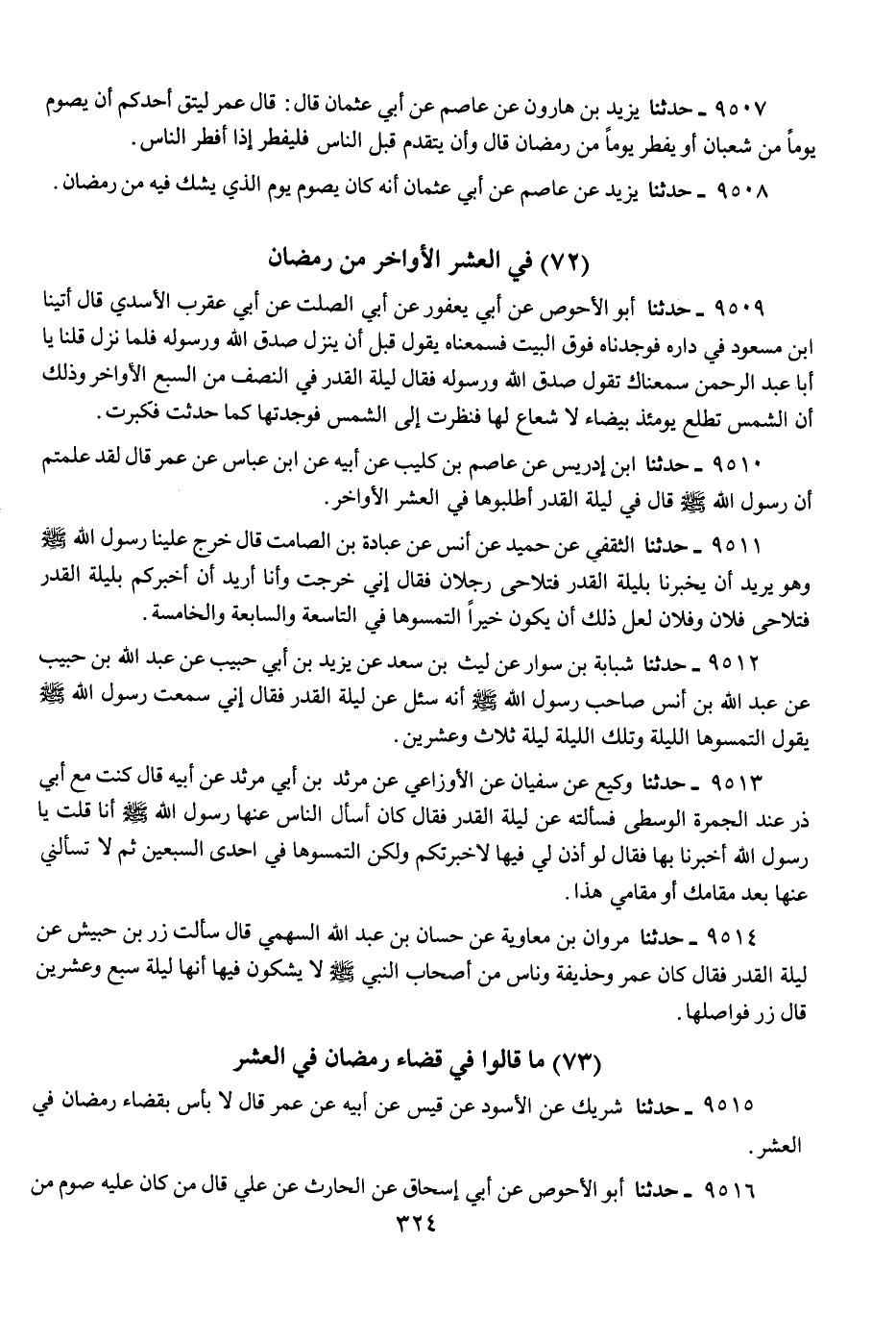 9509 - حَدَّثَنَا أَبُو الْأَحْوَصِ، عَنْ أَبِي يَعْفُورٍ، عَنْ أَبِي الصَّلْتِ، عَنْ أَبِي عَقْرَبٍ الْأَسَدِيِّ، قَالَ: أَتَيْنَا ابْنَ مَسْعُودٍ فِي دَارِهِ، فَوَجَدْنَاهُ فَوْقَ الْبَيْتِ، فَسَمِعْنَاهُ يَقُولُ قَبْلَ أَنْ يَنْزِلَ: صَدَقَ اللَّهُ وَرَسُولُهُ، فَلَمَّا نَزَلَ، قُلْنَا: يَا أَبَا عَبْدِ الرَّحْمَنِ، سَمِعْنَاكَ تَقُولُ: صَدَقَ اللَّهُ وَرَسُولُهُ، فَقَالَ: «§لَيْلَةُ الْقَدْرِ فِي النِّصْفِ، مِنَ السَّبْعِ الْأَوَاخِرِ، وَذَلِكَ أَنَّ الشَّمْسَ تَطْلُعُ، يَوْمَئِذٍ بَيْضَاءَ لَا شُعَاعَ لَهَا» فَنَظَرْتُ إِلَى الشَّمْسِ فَوَجَدْتُهَا كَمَا حُدِّثْتُ فَكَبَّرْتُ