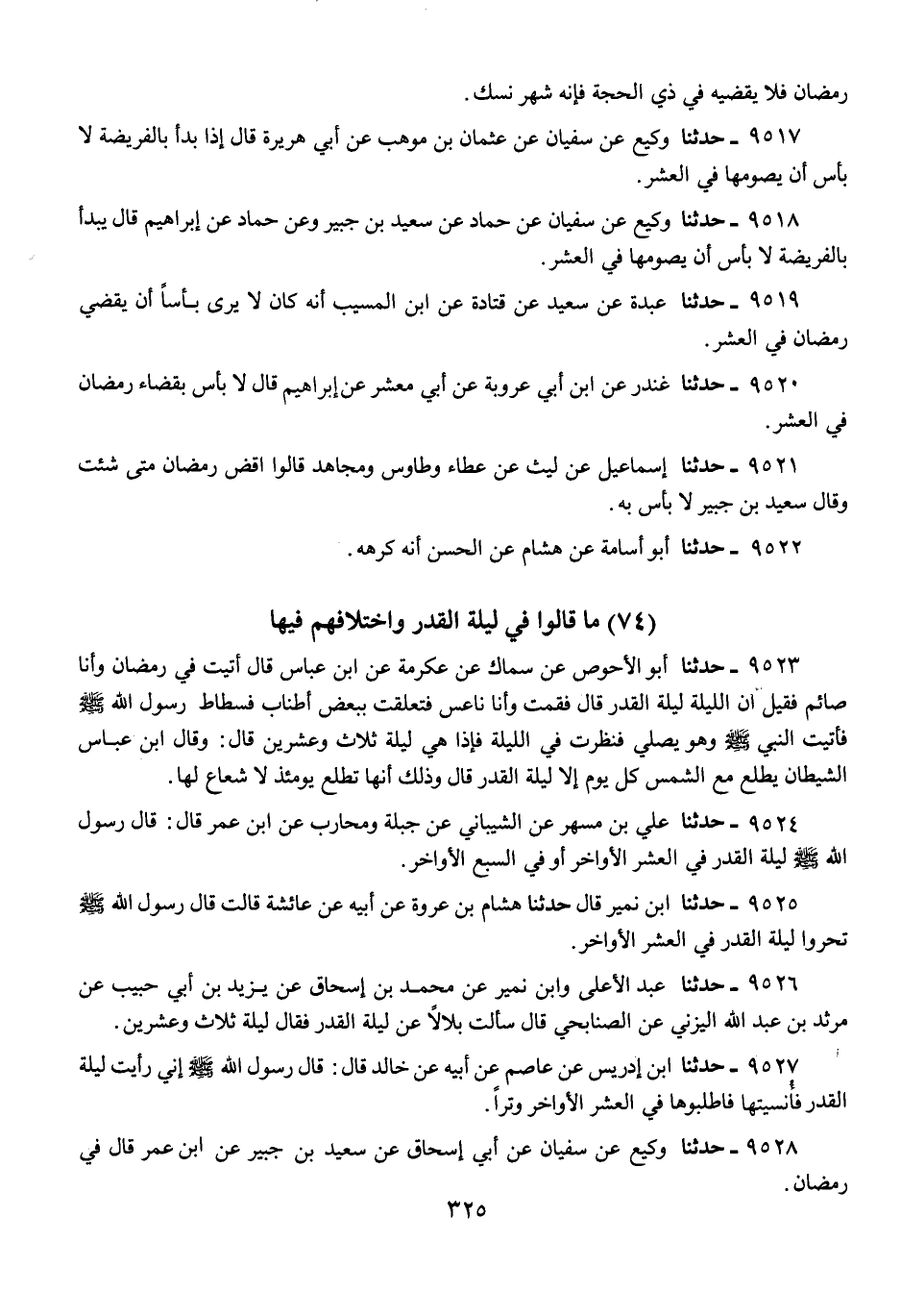 9528 - حَدَّثَنَا وَكِيعٌ، عَنْ سُفْيَانَ، عَنْ أَبِي إِسْحَاقَ، عَنْ سَعِيدِ بْنِ جُبَيْرٍ، عَنِ ابْنِ عُمَرَ، قَالَ: «§فِي رَمَضَانَ»