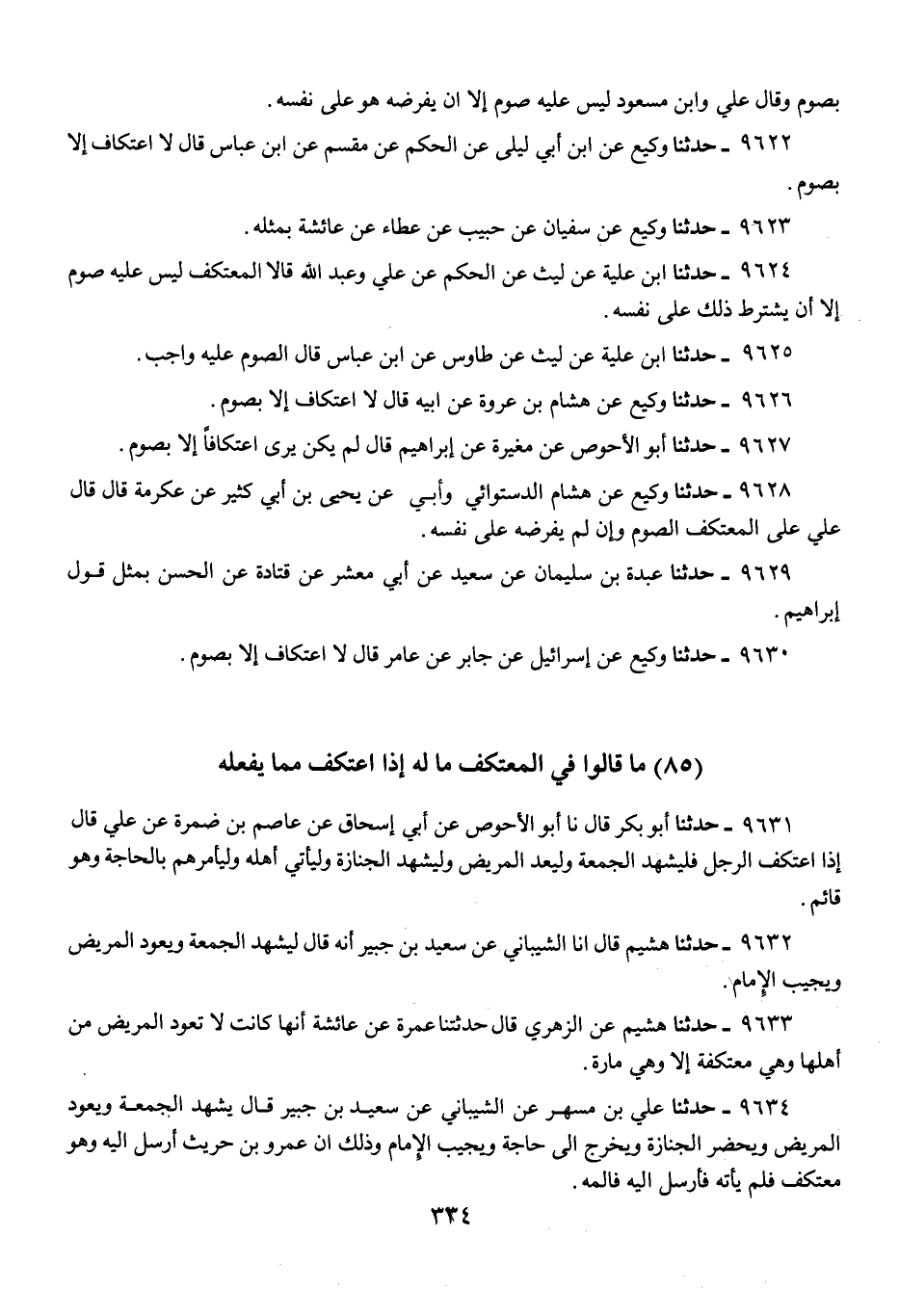 9630 - حَدَّثَنَا وَكِيعٌ، عَنْ إِسْرَائِيلَ، عَنْ جَابِرٍ، عَنْ عَامِرٍ، قَالَ: «§لَا اعْتِكَافَ إِلَّا بِصَوْمٍ»