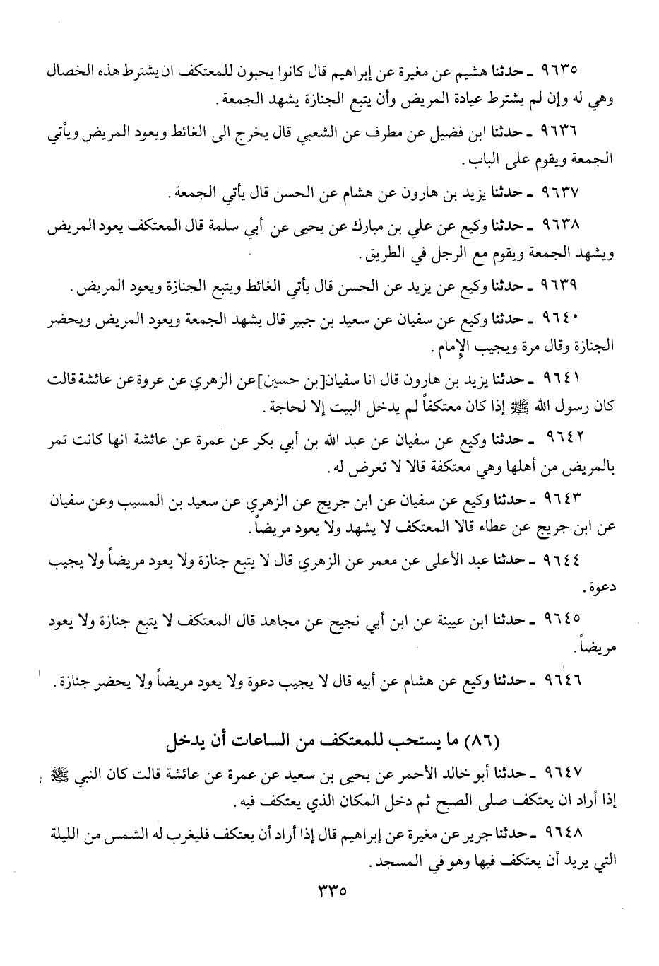 9642 - حَدَّثَنَا وَكِيعٌ، عَنْ سُفْيَانَ، عَنْ عَبْدِ اللَّهِ بْنِ أَبِي بَكْرٍ، عَنْ عَمْرَةَ، عَنْ عَائِشَةَ، «أَنَّهَا كَانَتْ §تَمُرُّ بِالْمَرِيضِ مِنْ أَهْلِهَا وَهِيَ مُعْتَكِفَةٌ» قَالَا: لَا تَعْرِضُ لَهُ