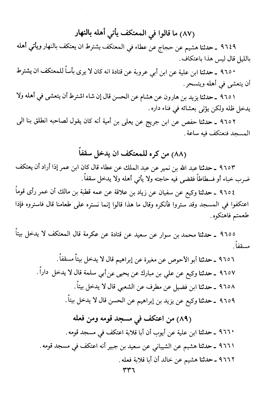 9649 - حَدَّثَنَا هُشَيْمٌ، عَنْ حَجَّاجٍ، عَنْ عَطَاءٍ، فِي الْمُعْتَكِفِ §يَشْتَرِطُ أَنْ يَعْتَكِفَ بِالنَّهَارِ، وَيَأْتِيَ أَهْلَهُ بِاللَّيْلِ، قَالَ: «لَيْسَ هَذَا بِاعْتِكَافٍ»
