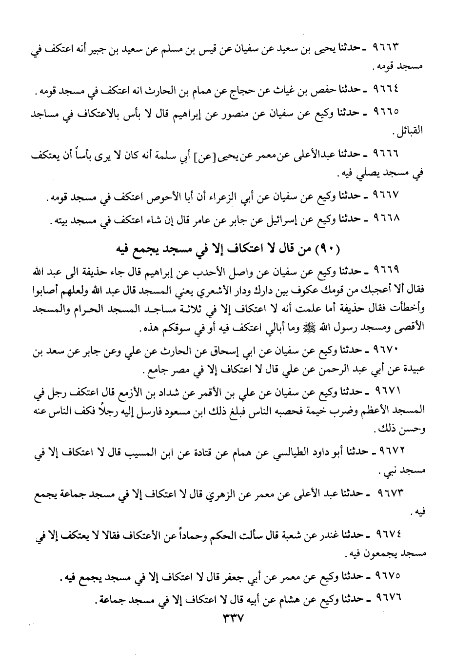 9669 - حَدَّثَنَا وَكِيعٌ، عَنْ سُفْيَانَ، عَنْ وَاصِلٍ الْأَحْدَبِ، عَنْ إِبْرَاهِيمَ، قَالَ: جَاءَ حُذَيْفَةُ إِلَى عَبْدِ اللَّهِ فَقَالَ: «أَلَا أَعْجَبَكَ مِنْ قَوْمِكَ عُكُوفٌ بَيْنَ دَارِكَ وَدَارِ الْأَشْعَرِيِّ» يَعْنِي الْمَسْجِدَ؟ قَالَ عَبْدُ اللَّهِ: وَلَعَلَّهُمْ أَصَابُوا وَأَخْطَأْتُ، فَقَالَ حُذَيْفَةُ: «أَمَا عَلِمْتَ أَنَّهُ §لَا اعْتِكَافَ إِلَّا فِي ثَلَاثَةِ مَسَاجِدَ الْمَسْجِدِ الْحَرَامِ، وَالْمَسْجِدِ الْأَقْصَى، وَمَسْجِدِ رَسُولِ اللَّهِ صَلَّى اللهُ عَلَيْهِ وَسَلَّمَ، وَمَا أُبَالِي أَعْتَكِفُ فِيهِ أَوْ فِي سُوقِكُمْ هَذِهِ»