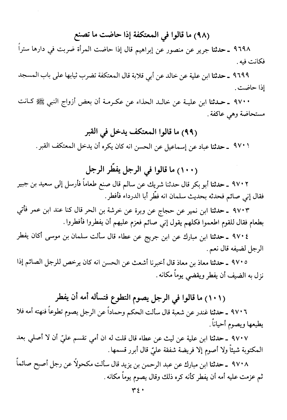 9706 - حَدَّثَنَا غُنْدَرٌ، عَنْ شُعْبَةَ، قَالَ: «سَأَلْتُ الْحَكَمَ، وَحَمَّادًا عَنْ §الرَّجُلِ يَصُومُ تَطَوُّعًا فَنَهَتْهُ أُمُّهُ، فَلَا يُطِيعُهَا، وَيَصُومُ أَحْيَانًا»