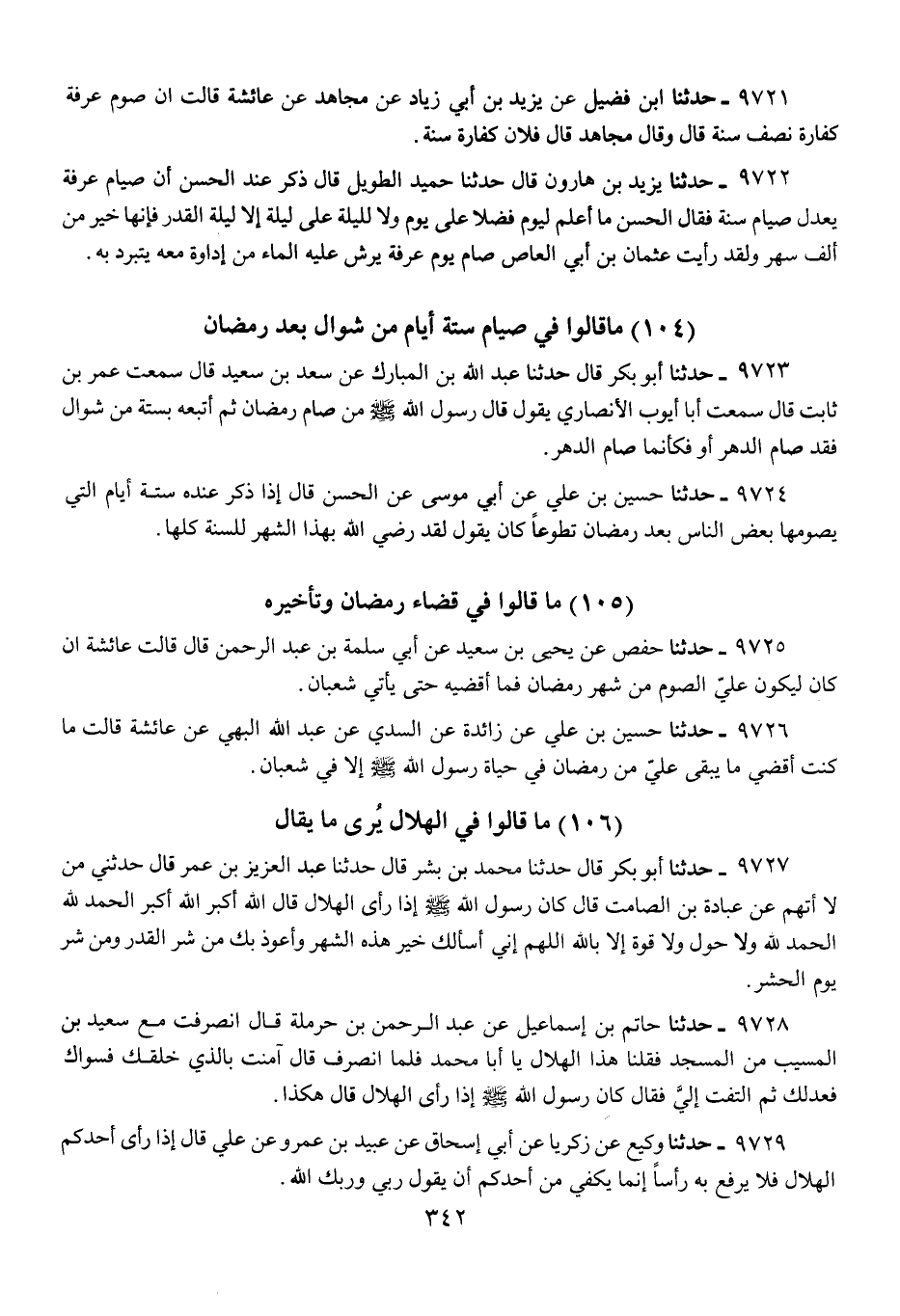 9723 - حَدَّثَنَا أَبُو بَكْرٍ قَالَ: حَدَّثَنَا عَبْدُ اللَّهِ بْنُ الْمُبَارَكِ، عَنْ سَعْدِ بْنِ سَعِيدٍ، قَالَ: سَمِعْتُ عُمَرَ بْنَ ثَابِتٍ، قَالَ: سَمِعْتُ أَبَا أَيُّوبَ الْأَنْصَارِيَّ، يَقُولُ: قَالَ رَسُولُ اللَّهِ صَلَّى اللهُ عَلَيْهِ وَسَلَّمَ: «§مَنْ صَامَ رَمَضَانَ، ثُمَّ أَتْبَعَهُ بِسِتَّةٍ مِنْ شَوَّالٍ، فَقَدْ صَامَ الدَّهْرَ، أَوْ فَكَأَنَّمَا صَامَ الدَّهْرَ»