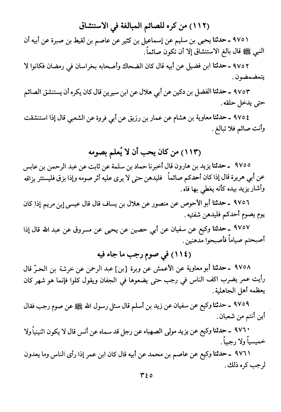 9760 - حَدَّثَنَا وَكِيعٌ، عَنْ يَزِيدَ، مَوْلَى الصَّهْبَاءِ عَنْ رَجُلٍ، قَدْ سَمَّاهُ عَنْ أَنَسٍ، قَالَ: «§لَا يَكُونُ اثْنَيْنِيًّا، وَلَا خَمِيسِيًّا، وَلَا رَجَبِيًّا»