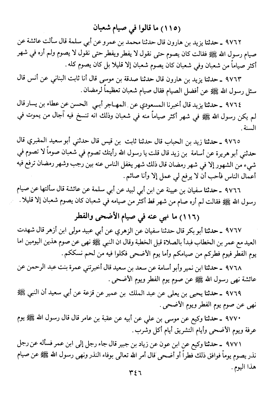 9766 - حَدَّثَنَا سُفْيَانُ بْنُ عُيَيْنَةَ، عَنِ ابْنِ أَبِي لَبِيدٍ، عَنْ أَبِي سَلَمَةَ، عَنْ عَائِشَةَ، قَالَ: سَأَلْتُهَا عَنْ صِيَامِ رَسُولِ اللَّهِ صَلَّى اللهُ عَلَيْهِ وَسَلَّمَ، فَقَالَتْ: «§لَمْ أَرَهُ صَامَ مِنْ شَهْرٍ قَطُّ أَكْثَرَ مِنْ صِيَامِهِ فِي شَعْبَانَ، كَانَ يَصُومُ شَعْبَانَ، إِلَّا قَلِيلًا»