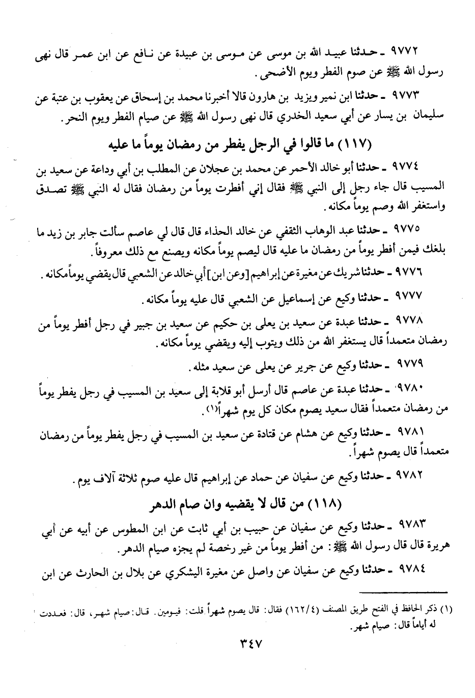 9784 - حَدَّثَنَا وَكِيعٌ، عَنْ سُفْيَانَ، عَنْ وَاصِلٍ، عَنْ مُغِيرَةَ الْيَشْكُرِيِّ، عَنْ بِلَالِ بْنِ الْحَارِثِ، عَنِ ابْنِ مَسْعُودٍ، قَالَ: «§مَنْ أَفْطَرَ يَوْمًا مِنْ رَمَضَانَ مِنْ غَيْرِ رُخْصَةٍ لَمْ يُجْزِهِ صِيَامُ الدَّهْرِ كُلِّهِ»