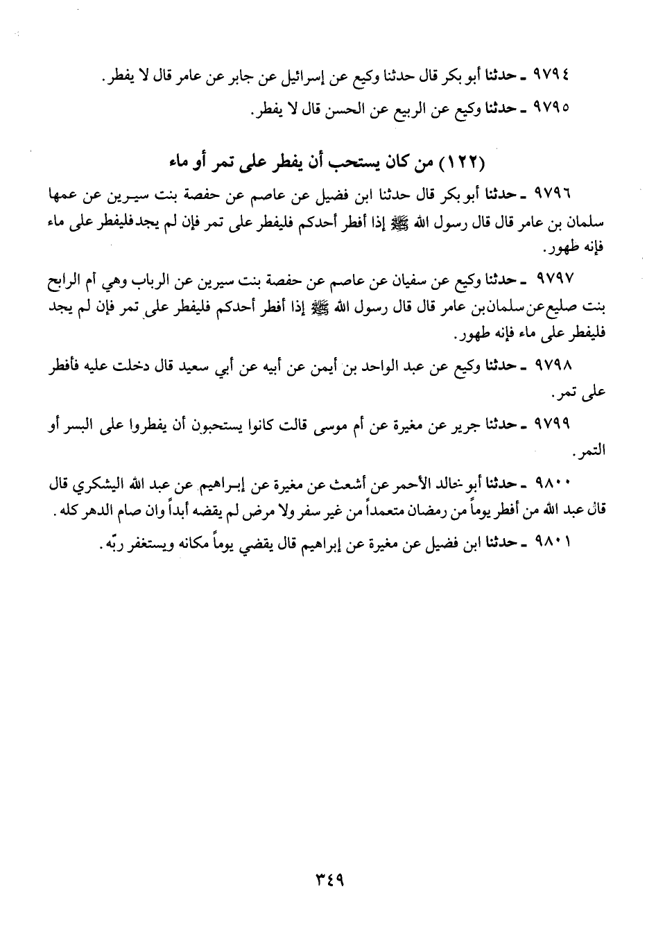 9797 - حَدَّثَنَا وَكِيعٌ، عَنْ سُفْيَانَ، عَنْ عَاصِمٍ، عَنْ حَفْصَةَ بِنْتِ سِيرِينَ، عَنِ الرَّبَابِ، وَهِيَ أُمُّ الرَّائِحِ بِنْتُ صُلَيْعٍ، عَنْ سَلْمَانَ بْنِ عَامِرٍ، قَالَ: قَالَ رَسُولُ اللَّهِ صَلَّى اللهُ عَلَيْهِ وَسَلَّمَ: «§إِذَا أَفْطَرَ أَحَدُكُمْ فَلْيُفْطِرْ عَلَى تَمْرٍ، فَإِنْ لَمْ يَجِدْ فَلْيُفْطِرْ عَلَى مَاءٍ، فَإِنَّهُ طَهُورٌ»