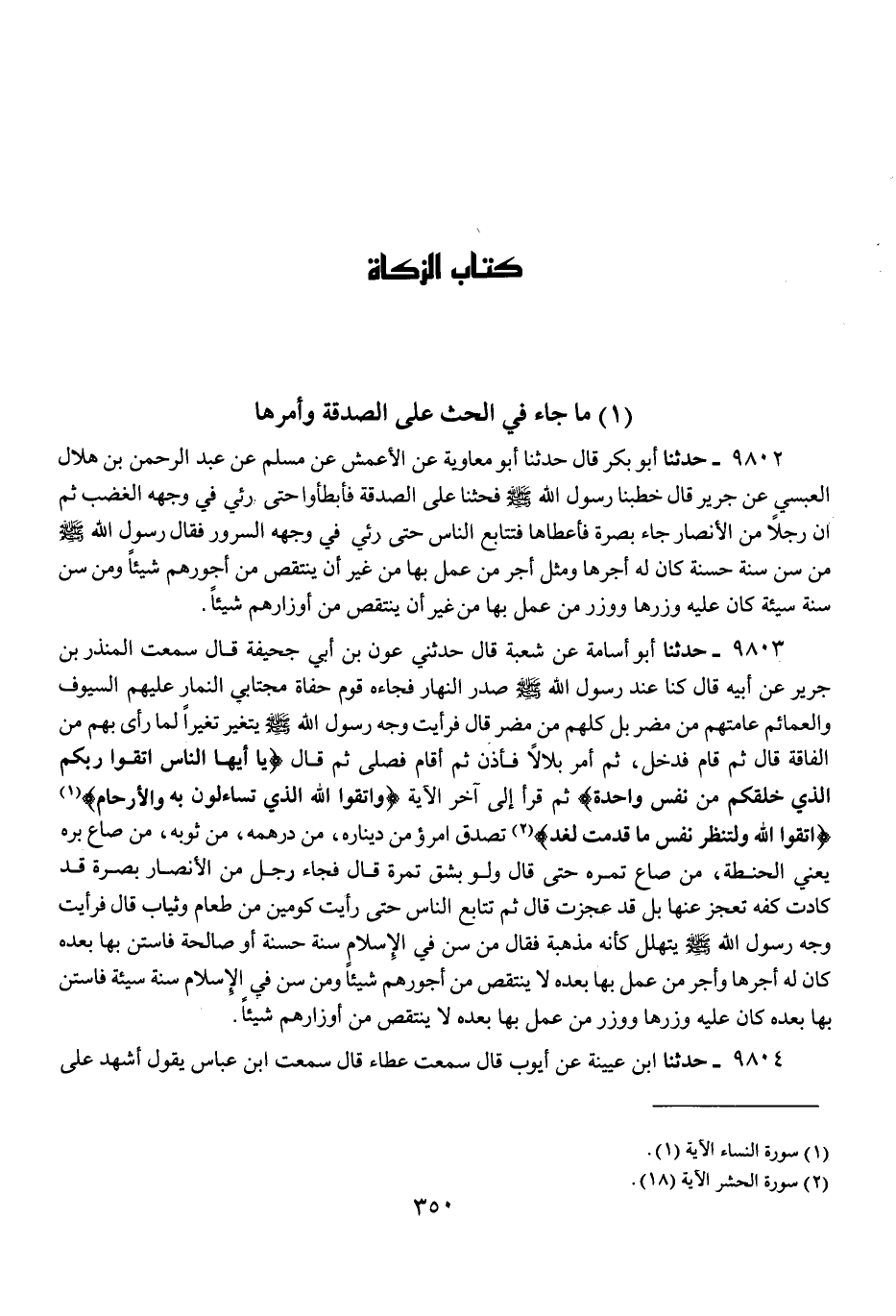 9802 - حَدَّثَنَا أَبُو بَكْرٍ قَالَ: حَدَّثَنَا أَبُو مُعَاوِيَةَ، عَنِ الْأَعْمَشِ، عَنْ مُسْلِمٍ، عَنْ عَبْدِ الرَّحْمَنِ بْنِ هِلَالٍ الْعَبْسِيِّ، عَنْ جَرِيرٍ، قَالَ: خَطَبَنَا رَسُولُ اللَّهِ صَلَّى اللهُ عَلَيْهِ وَسَلَّمَ فَحَثَّنَا عَلَى الصَّدَقَةِ فَأَبْطَأُوا حَتَّى رُئِيَ فِي وَجْهِهِ الْغَضَبُ، ثُمَّ إِنَّ رَجُلًا مِنَ الْأَنْصَارِ جَاءَ بِصُرَّةٍ فَأَعْطَاهَا فَتَتَابَعَ النَّاسُ حَتَّى رُئِيَ فِي وَجْهِهِ السُّرُورُ، فَقَالَ رَسُولُ اللَّهِ صَلَّى اللهُ عَلَيْهِ وَسَلَّمَ: «§مَنْ سَنَّ سُنَّةً حَسَنَةً كَانَ لَهُ أَجْرُهَا وَمِثْلُ أَجْرِ مَنْ عَمِلَ بِهَا مِنْ غَيْرِ أَنْ يَنْتَقِصَ مِنْ أُجُورِهِمْ شَيْئًا، وَمَنْ سَنَّ سُنَّةً سَيِّئَةً كَانَ عَلَيْهِ وِزْرُهَا وَوِزْرُ مَنْ عَمِلَ بِهَا مِنْ غَيْرِ أَنْ يَنْتَقِصَ مِنْ أَوْزَارِهِمْ شَيْئًا»