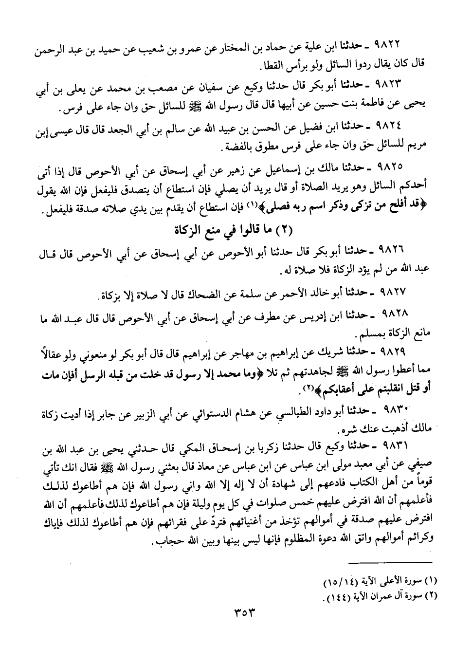 9828 - حَدَّثَنَا ابْنُ إِدْرِيسَ، عَنْ مُطَرِّفٍ، عَنْ أَبِي إِسْحَاقَ، عَنْ أَبِي الْأَحْوَصِ، قَالَ: قَالَ عَبْدُ اللَّهِ: «§مَا مَانِعُ الزَّكَاةِ بِمُسْلِمٍ»