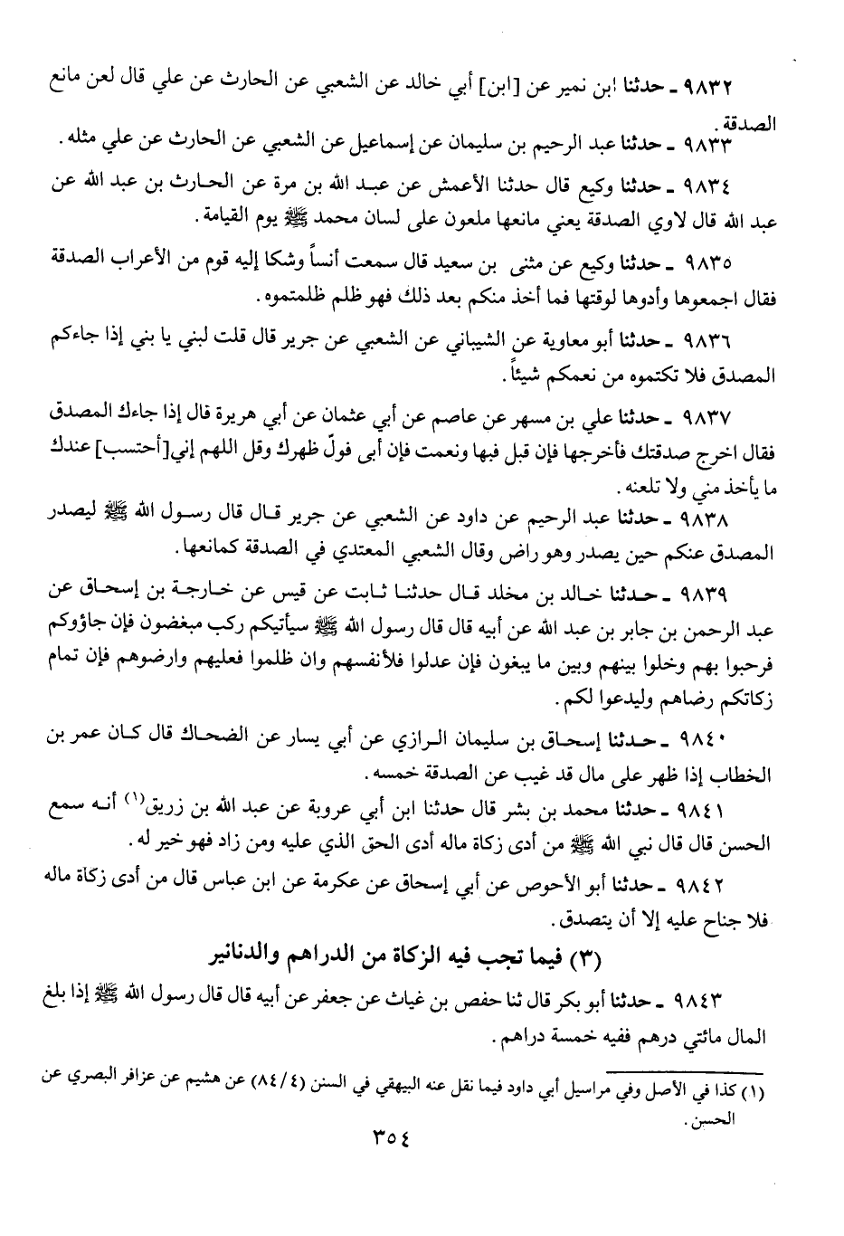 9838 - حَدَّثَنَا عَبْدُ الرَّحِيمِ، عَنْ دَاوُدَ، عَنِ الشَّعْبِيِّ، عَنْ جَرِيرٍ، قَالَ: قَالَ رَسُولُ اللَّهِ صَلَّى اللهُ عَلَيْهِ وَسَلَّمَ: «§لِيَصْدُرَ الْمُصَدِّقُ عَنْكُمْ حِينَ يُصْدِرُ وَهُوَ رَاضٍ». وَقَالَ الشَّعْبِيُّ: «الْمُعْتَدِي فِي الصَّدَقَةِ كَمَانِعِهَا»