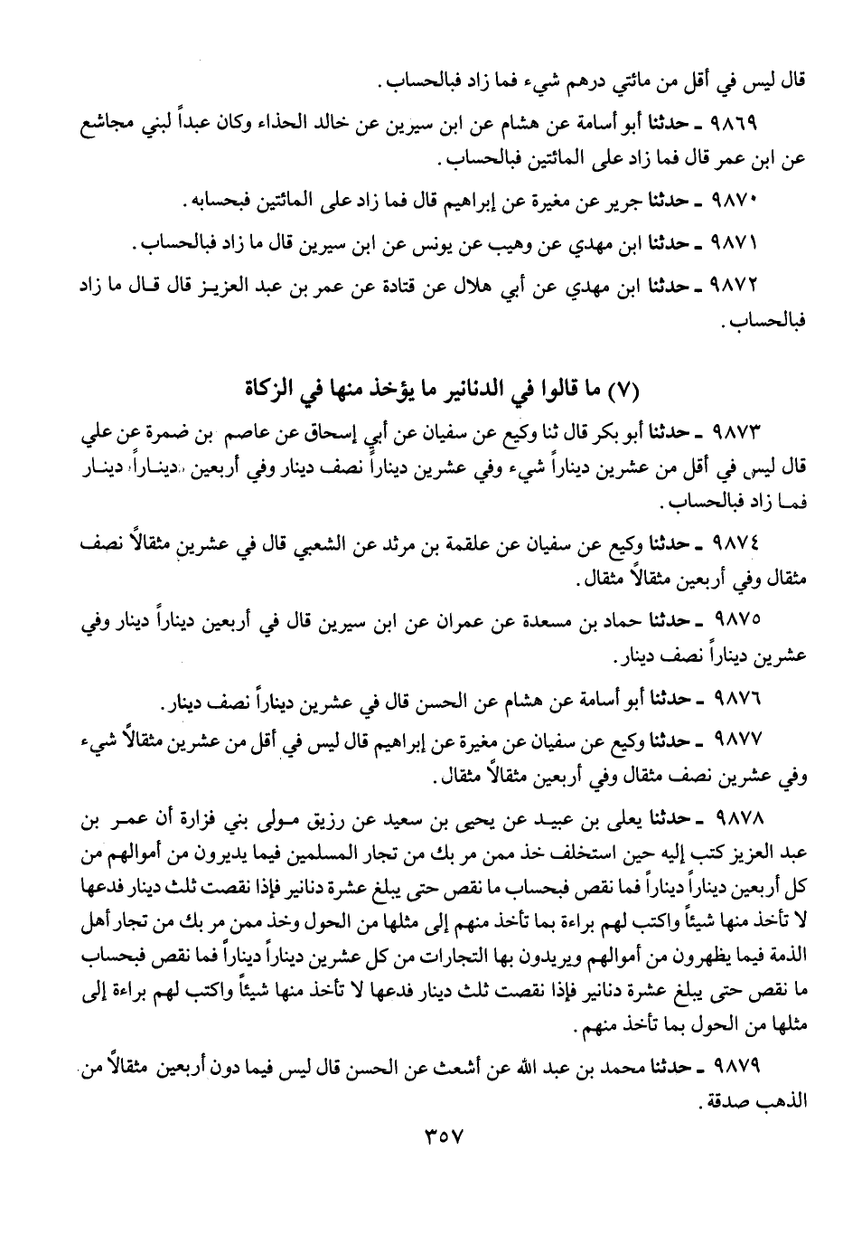 9869 - حَدَّثَنَا أَبُو أُسَامَةَ، عَنْ هِشَامٍ، عَنِ ابْنِ سِيرِينَ، عَنْ خَالِدٍ الْحَذَّاءِ وَكَانَ عَبْدًا لِبَنِي مُجَاشِعٍ، عَنِ ابْنِ عُمَرَ، قَالَ: «§فَمَا زَادَ عَلَى الْمِائَتَيْنِ فَبِالْحِسَابِ»