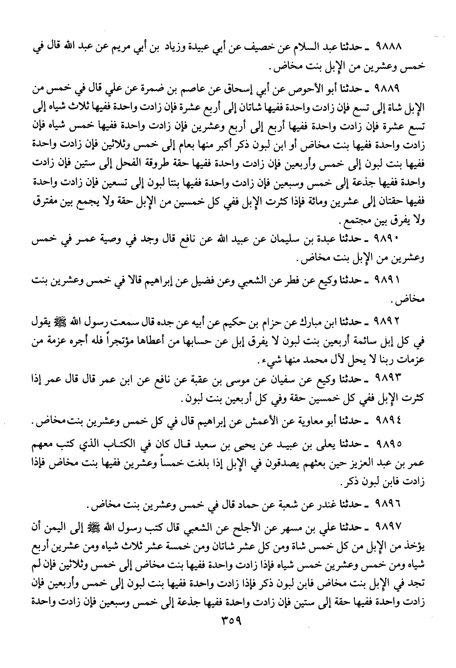 9889 - حَدَّثَنَا أَبُو الْأَحْوَصِ، عَنْ أَبِي إِسْحَاقَ، عَنْ عَاصِمِ بْنِ ضَمْرَةَ، عَنْ عَلِيٍّ، قَالَ: «§فِي خَمْسٍ مِنَ الْإِبِلِ شَاةٌ إِلَى تِسْعٍ، فَإِنْ زَادَتْ وَاحِدَةً فَفِيهَا شَاتَانِ إِلَى أَرْبَعَ عَشْرَةَ، فَإِنْ زَادَتْ وَاحِدَةً فَفِيهَا ثَلَاثُ شِيَاهٍ إِلَى تِسْعَ عَشْرَةَ، فَإِنْ زَادَتْ وَاحِدَةً فَفِيهَا أَرْبَعٌ إِلَى أَرْبَعٍ وَعِشْرِينَ، فَإِنْ زَادَتْ وَاحِدَةً فَفِيهَا خَمْسُ شِيَاهٍ، فَإِنْ زَادَتْ وَاحِدَةً فَفِيهَا بِنْتُ مَخَاضٍ أَوِ ابْنُ لَبُونٍ ذَكَرٌ أَكْبَرُ مِنْهَا بِعَامٍ إِلَى خَمْسٍ وَثَلَاثِينَ، فَإِنْ زَادَتْ وَاحِدَةً فَفِيهَا بِنْتُ لَبُونٍ إِلَى خَمْسٍ وَأَرْبَعِينَ، فَإِنْ زَادَتْ وَاحِدَةً فَفِيهَا حِقَّةٌ طَرُوقَةُ الْفَحْلِ إِلَى سِتِّينَ، فَإِنْ زَادَتْ وَاحِدَةً فَفِيهَا جَذَعَةٌ إِلَى خَمْسٍ وَسَبْعِينَ، فَإِنْ زَادَتْ وَاحِدَةً فَفِيهَا بِنْتَا لَبُونٍ إِلَى تِسْعِينَ، فَإِنْ زَادَتْ وَاحِدَةً فَفِيهَا حِقَّتَانِ إِلَى عِشْرِينَ وَمِائَةٍ، فَإِذَا كَثُرَتِ الْإِبِلُ فَفِي كُلِّ خَمْسِينَ مِنَ الْإِبِلِ حِقَّةٌ وَلَا يُجْمَعُ بَيْنَ مُفْتَرِقٍ، وَلَا يُفَرَّقُ بَيْنَ مُجْتَمِعٍ»