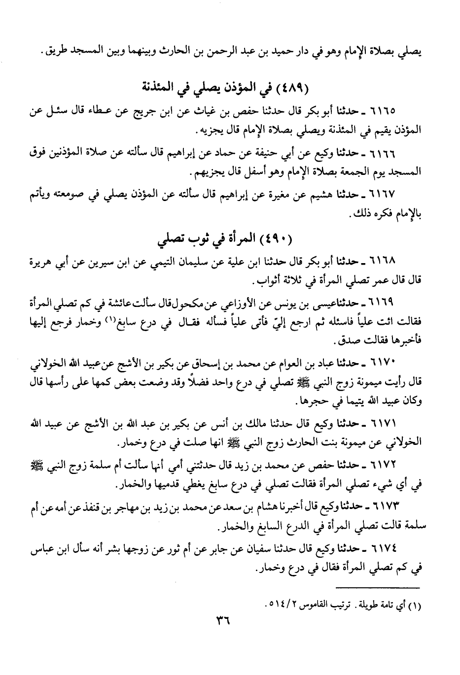 6171 - حَدَّثَنَا وَكِيعٌ، قَالَ: حَدَّثَنَا مَالِكُ بْنُ أَنَسٍ، عَنْ بُكَيْرِ بْنِ عَبْدِ اللَّهِ بْنِ الْأَشَجِّ، عَنْ عُبَيْدِ اللَّهِ الْخَوْلَانِيِّ، عَنْ مَيْمُونَةَ بِنْتِ الْحَارِثِ، زَوْجِ النَّبِيِّ صَلَّى اللهُ عَلَيْهِ وَسَلَّمَ «أَنَّهَا §صَلَّتْ فِي دِرْعٍ وَخِمَارٍ»