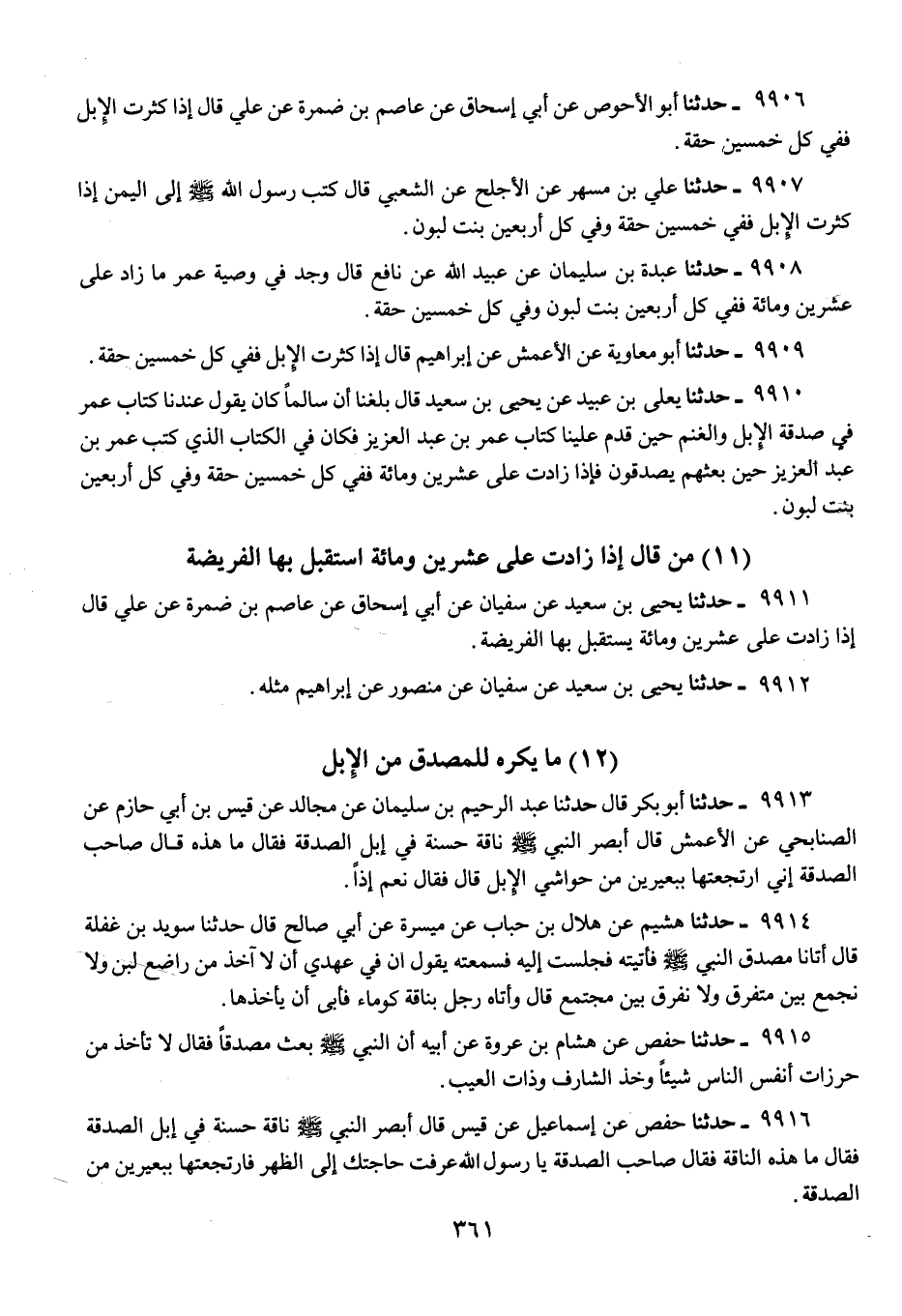 9908 - حَدَّثَنَا عَبْدَةُ بْنُ سُلَيْمَانَ، عَنْ عُبَيْدِ اللَّهِ، عَنْ نَافِعٍ، قَالَ: وُجِدَ فِي وَصِيَّةِ عُمَرَ «§مَا زَادَ عَلَى عِشْرِينَ وَمِائَةٍ، فَفِي كُلِّ أَرْبَعِينَ بِنْتُ لَبُونٍ، وَفِي كُلِّ خَمْسِينَ حِقَّةٌ»