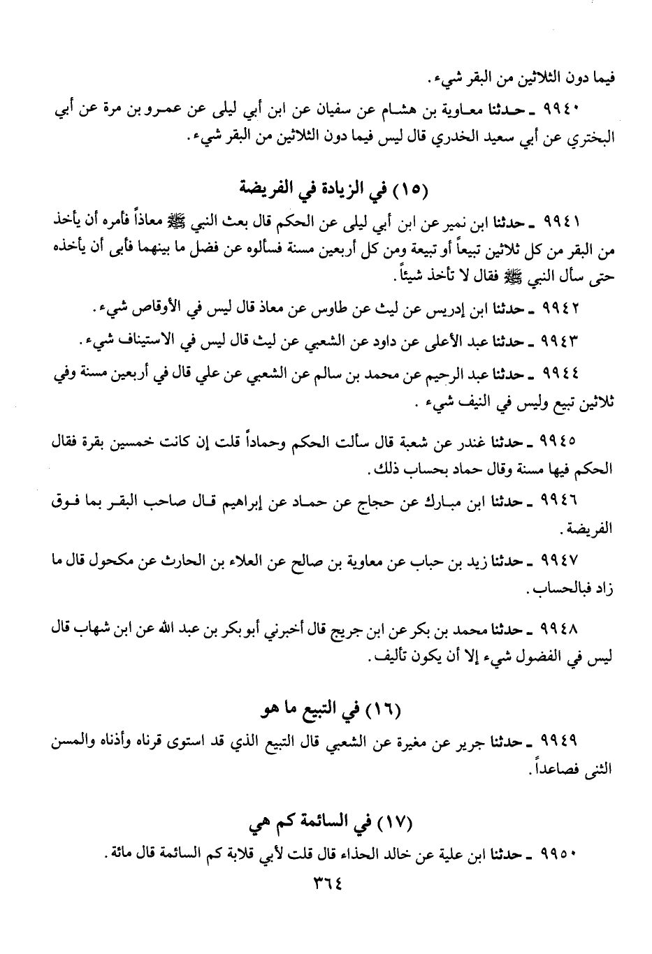 9941 - حَدَّثَنَا ابْنُ نُمَيْرٍ، عَنِ ابْنِ أَبِي لَيْلَى، عَنِ الْحَكَمِ، قَالَ: بَعَثَ النَّبِيُّ صَلَّى اللهُ عَلَيْهِ وَسَلَّمَ مُعَاذًا «فَأَمَرَهُ أَنْ §يَأْخُذَ مِنَ الْبَقَرِ مِنْ كُلِّ ثَلَاثِينَ تَبِيعًا أَوْ تَبِيعَةً، وَمِنْ كُلِّ أَرْبَعِينَ مُسِنَّةً»، فَسَأَلُوهُ عَنْ فَضْلِ مَا بَيْنَهُمَا فَأَبَى أَنْ يَأْخُذَهُ حَتَّى سَأَلَ النَّبِيَّ صَلَّى اللهُ عَلَيْهِ وَسَلَّمَ فَقَالَ: «لَا تَأْخُذْ شَيْئًا»