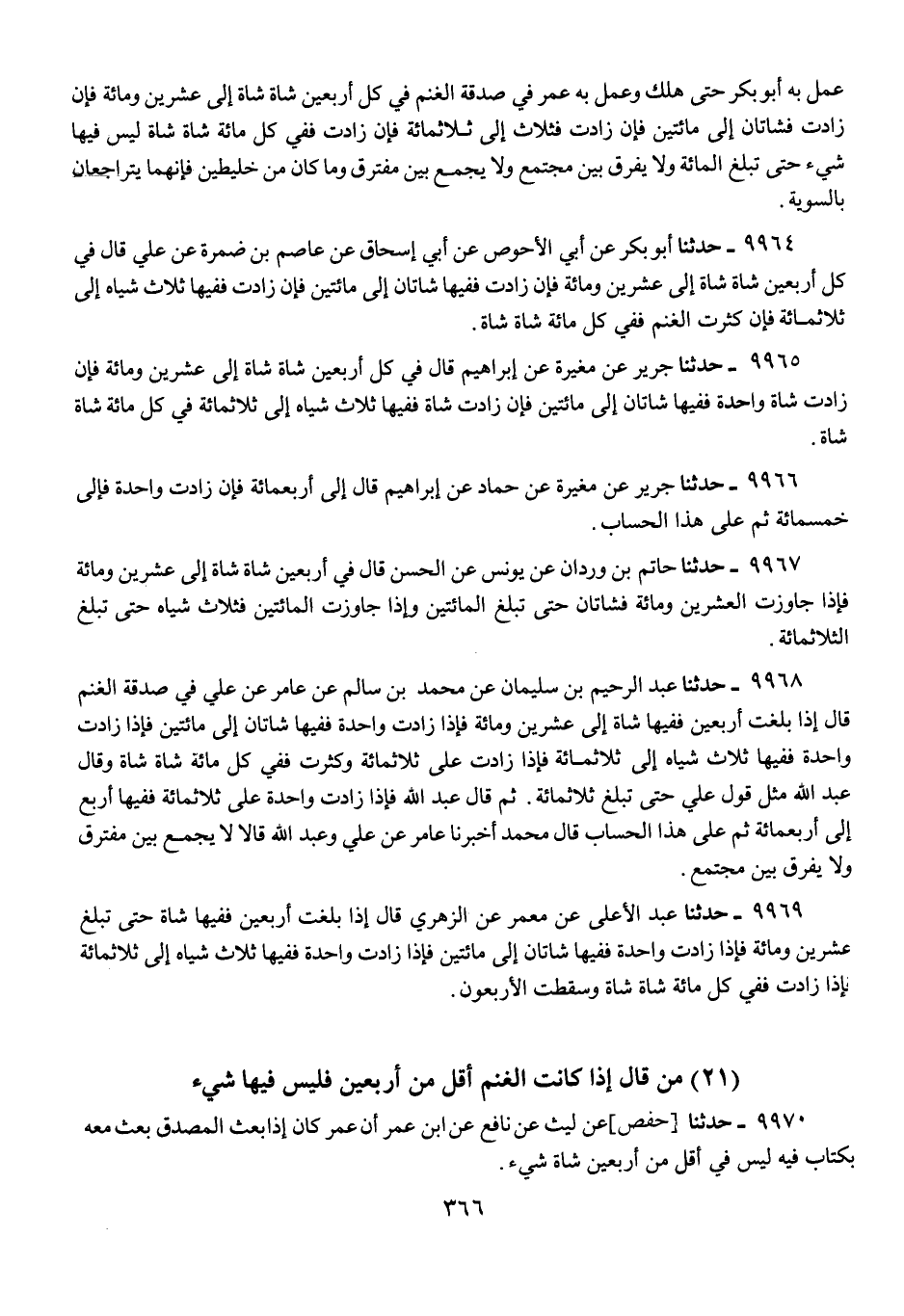 9968 - حَدَّثَنَا عَبْدُ الرَّحِيمِ بْنُ سُلَيْمَانَ، عَنْ مُحَمَّدِ بْنِ سَالِمٍ، عَنْ عَامِرٍ، عَنْ عَلِيٍّ فِي §صَدَقَةِ الْغَنَمِ قَالَ: «إِذَا بَلَغَتْ أَرْبَعِينَ فَفِيهَا شَاةٌ إِلَى عِشْرِينَ وَمِائَةٍ، فَإِذَا زَادَتْ وَاحِدَةً فَفِيهَا شَاتَانِ إِلَى مِائَتَيْنِ، فَإِذَا زَادَتْ وَاحِدَةً فَفِيهَا ثَلَاثُ شِيَاهٍ إِلَى ثَلَاثِمِائَةٍ، فَإِذَا زَادَتْ عَلَى ثَلَاثِمِائَةٍ وَكَثُرَتْ فَفِي كُلِّ مِائَةِ شَاةٍ شَاةٌ». وَقَالَ عَبْدُ اللَّهِ: مِثْلَ قَوْلِ عَلِيٍّ «حَتَّى تَبْلُغَ ثَلَاثَمِائَةٍ» ثُمَّ قَالَ عَبْدُ اللَّهِ: «فَإِذَا زَادَتْ وَاحِدَةً عَلَى ثَلَاثِمِائَةٍ فَفِيهَا أَرْبَعٌ إِلَى أَرْبَعِمِائَةٍ ثُمَّ عَلَى هَذَا الْحِسَابُ»