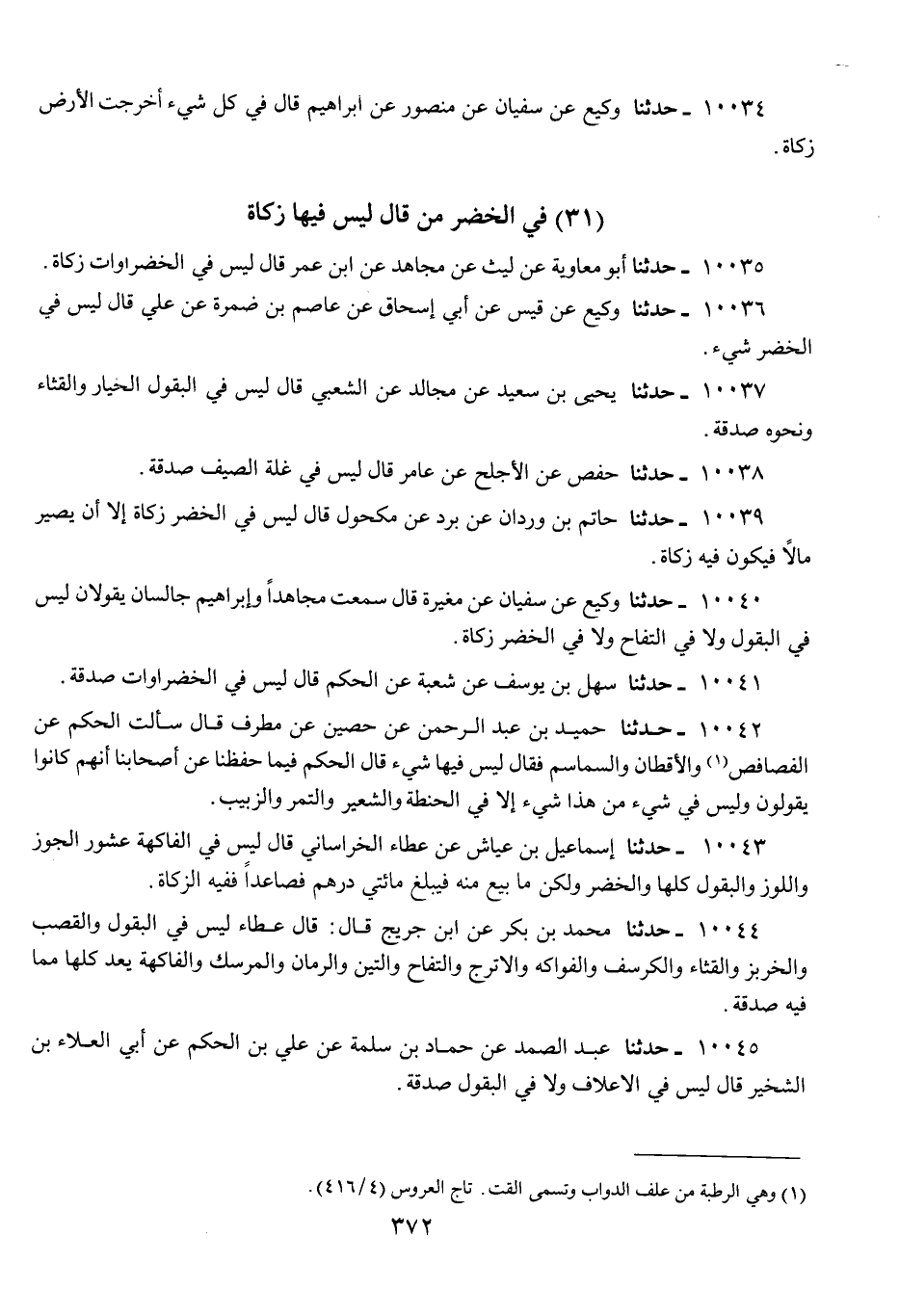 10045 - حَدَّثَنَا عَبْدُ الصَّمَدِ، عَنْ حَمَّادِ بْنِ سَلَمَةَ، عَنْ عَلِيِّ بْنِ الْحَكَمِ، عَنْ أَبِي الْعَلَاءِ بْنِ الشِّخِّيرِ، قَالَ: «§لَيْسَ فِي الْأَعْلَافِ، وَلَا فِي الْبُقُولِ صَدَقَةٌ»