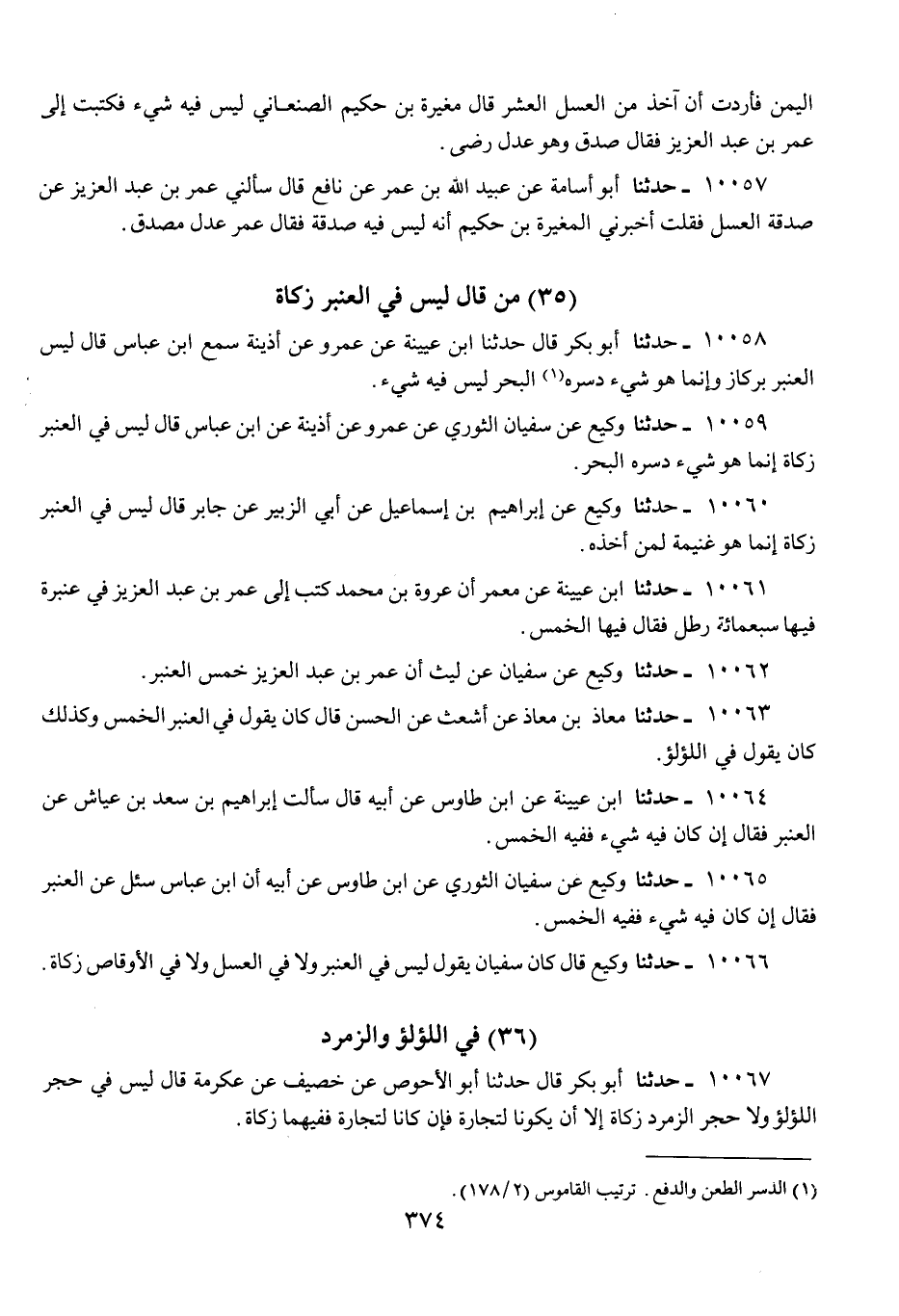 10059 - حَدَّثَنَا وَكِيعٌ، عَنْ سُفْيَانَ الثَّوْرِيِّ، عَنْ عَمْرٍو، عَنْ ابْنِ أُذَيْنَةَ، عَنِ ابْنِ عَبَّاسٍ، قَالَ: «§لَيْسَ فِي الْعَنْبَرِ زَكَاةٌ، إِنَّمَا هُوَ شَيْءٌ دَسَرَهُ الْبَحْرُ»