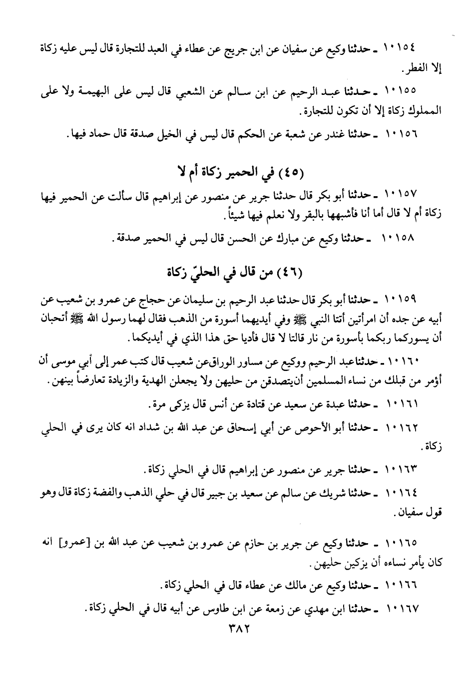 10165 - حَدَّثَنَا وَكِيعٌ، عَنْ جَرِيرِ بْنِ حَازِمٍ، عَنْ عَمْرِو بْنِ شُعَيْبٍ، عَنْ عَبْدِ اللَّهِ بْنِ عُمَرَ، أَنَّهُ كَانَ «§يَأْمُرُ نِسَاءَهُ أَنْ يُزَكِّينَ حُلِيَّهُنَّ»
