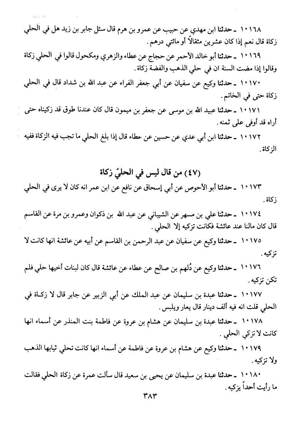 10173 - حَدَّثَنَا أَبُو الْأَحْوَصِ، عَنْ أَبِي إِسْحَاقَ، عَنْ نَافِعٍ، عَنِ ابْنِ عُمَرَ أَنَّهُ كَانَ «§لَا يَرَى فِي الْحُلِيِّ زَكَاةً»