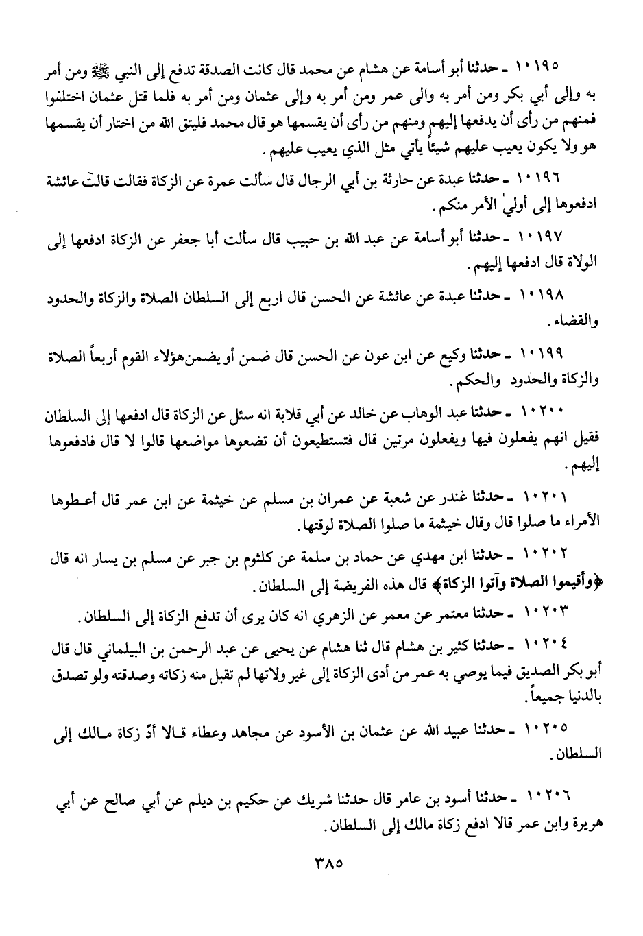 10195 - حَدَّثَنَا أَبُو أُسَامَةَ، عَنْ هِشَامٍ، عَنْ مُحَمَّدٍ، قَالَ: «كَانَتْ §الصَّدَقَةُ تُدْفَعُ إِلَى النَّبِيِّ صَلَّى اللهُ عَلَيْهِ وَسَلَّمَ وَمَنْ أَمَرَ بِهِ، وَإِلَى أَبِي بَكْرٍ وَمَنْ أَمَرَ بِهِ، وَإِلَى عُمَرَ وَمَنْ أَمَرَ بِهِ، وَإِلَى عُثْمَانَ وَمَنْ أَمَرَ بِهِ، فَلَمَّا قُتِلَ عُثْمَانُ اخْتَلَفُوا فَمِنْهُمْ مَنْ رَأَى أَنْ يَدْفَعَهَا إِلَيْهِمْ، وَمِنْهُمْ مِنْ رَأَى أَنْ يَقْسِمَهَا هُوَ»، قَالَ مُحَمَّدٌ: «فَلْيَتَّقِ اللَّهَ مَنِ اخْتَارَ أَنْ يَقْسِمَهَا هُوَ، وَلَا يَكُونَ يَعِيبُ عَلَيْهِمْ شَيْئًا يَأْتِي مِثْلُ الَّذِي يَعِيبُ عَلَيْهِمْ»