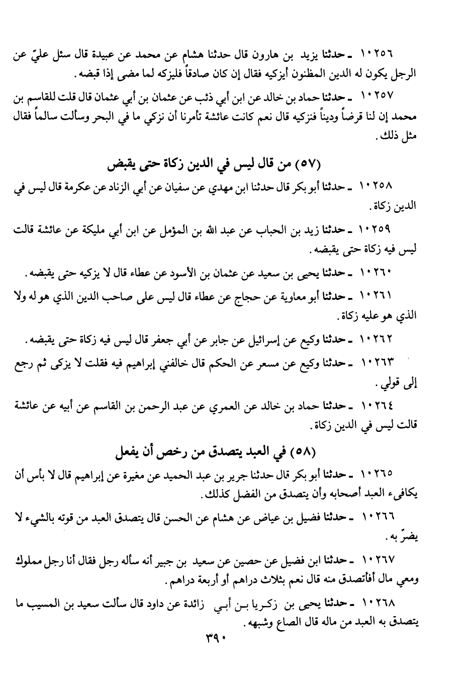 10264 - حَدَّثَنَا حَمَّادُ بْنُ خَالِدٍ، عَنِ الْعُمَرِيِّ، عَنْ عَبْدِ الرَّحْمَنِ بْنِ الْقَاسِمِ، عَنْ أَبِيهِ، عَنْ عَائِشَةَ، قَالَتْ: «§لَيْسَ فِي الدَّيْنِ زَكَاةٌ»