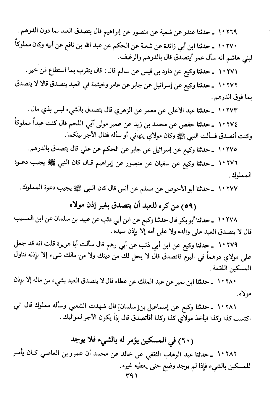 10280 - حَدَّثَنَا ابْنُ نُمَيْرٍ، عَنْ عَبْدِ الْمَلِكِ، عَنْ عَطَاءٍ، قَالَ: «§لَا يَتَصَدَّقُ الْعَبْدُ بِشَيْءٍ مِنْ مَالِهِ إِلَّا بِإِذْنِ مَوْلَاهُ»