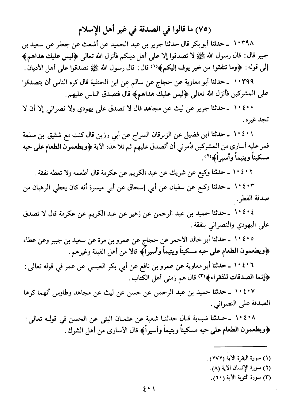 10401 - حَدَّثَنَا ابْنُ فُضَيْلٍ، عَنِ الزِّبْرِقَانِ السَّرَّاجِ، عَنْ أَبِي رَزِينٍ، قَالَ: كُنْتُ مَعَ سُفْيَانَ بْنِ سَلَمَةَ «§فَمَرَّ عَلَيْهِ أُسَارَى مِنَ الْمُشْرِكِينَ، فَأَمَرَنِي أَنْ أَتَصَدَّقَ عَلَيْهِمْ» ثُمَّ تَلَا هَذِهِ الْآيَةَ {وَيُطْعِمُونَ الطَّعَامَ عَلَى حُبِّهِ مِسْكِينًا وَيَتِيمًا وَأَسِيرًا} [الإنسان: 8]