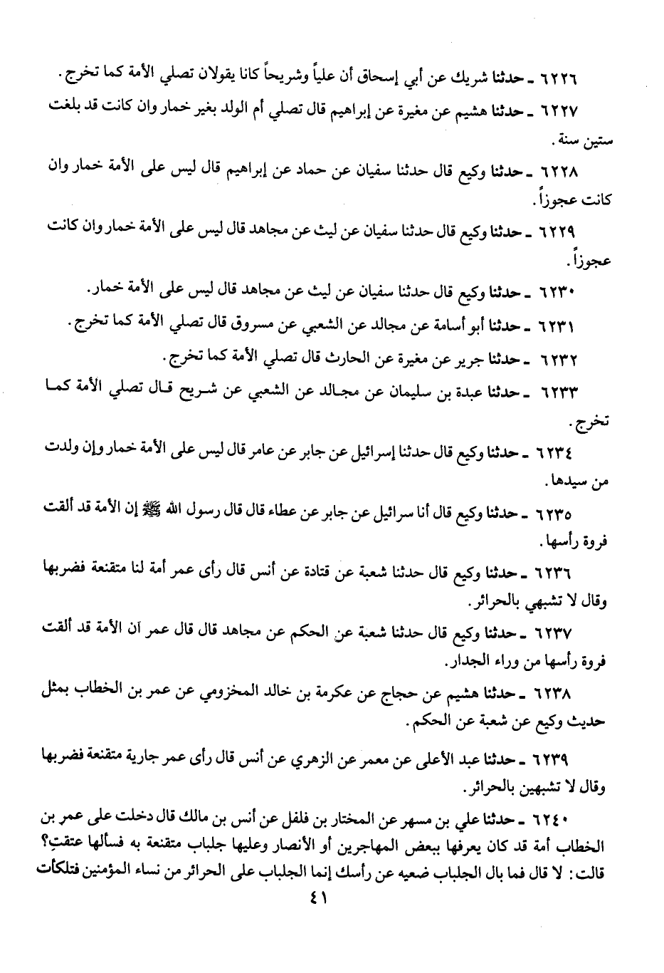 6228 - حَدَّثَنَا وَكِيعٌ، قَالَ: حَدَّثَنَا سُفْيَانُ، عَنْ حَمَّادٍ، عَنْ إِبْرَاهِيمَ، قَالَ: «§لَيْسَ عَلَى الْأَمَةِ خِمَارٌ وَإِنْ كَانَتْ عَجُوزًا»
