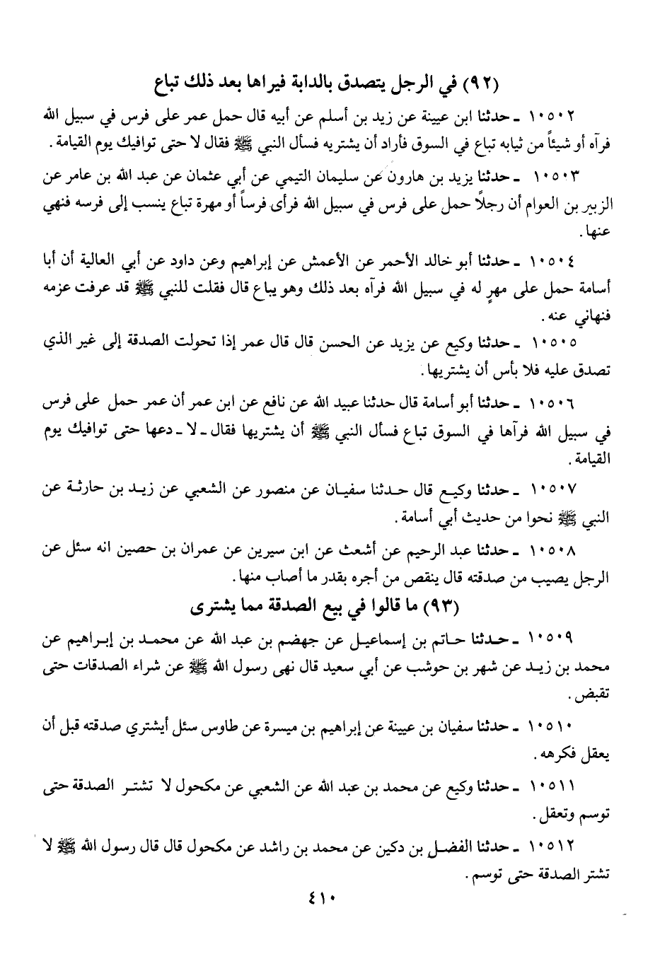 10511 - حَدَّثَنَا وَكِيعٌ، عَنْ مُحَمَّدِ بْنِ عَبْدِ اللَّهِ، عَنِ الشَّعْبِيِّ، عَنْ مَكْحُولٍ، «§لَا تُشْتَرَى الصَّدَقَةَ حَتَّى تُوسَمَ وَتُعْقَلَ»