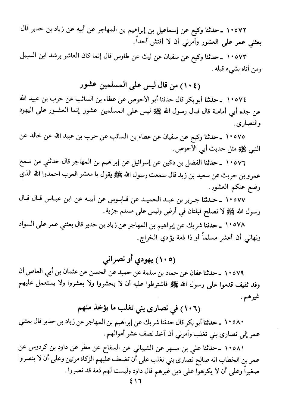 10578 - حَدَّثَنَا شَرِيكٌ، عَنْ إِبْرَاهِيمَ بْنِ الْمُهَاجِرِ، عَنْ زِيَادِ بْنِ حُدَيْرٍ، قَالَ: «بَعَثَنِي عُمَرُ عَلَى السَّوَادِ، §وَنَهَانِي أَنْ أَعْشُرَ مُسْلِمًا أَوْ ذَا ذِمَّةٍ يُؤَدِّي الْخَرَاجَ يَهُودِيٌّ أَوْ نَصْرَانِيٌّ»
