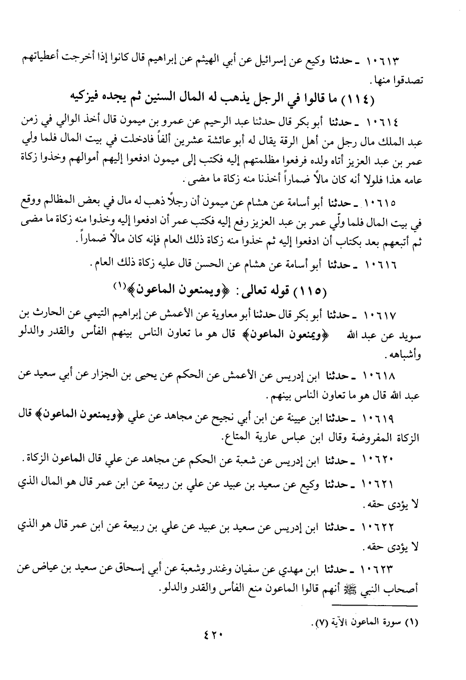 10620 - حَدَّثَنَا ابْنُ إِدْرِيسَ، عَنْ شُعْبَةَ، عَنِ الْحَكَمِ، عَنْ مُجَاهِدٍ، عَنْ عَلِيٍّ، قَالَ {§الْمَاعُونُ} [الماعون: 7]: «الزَّكَاةُ»