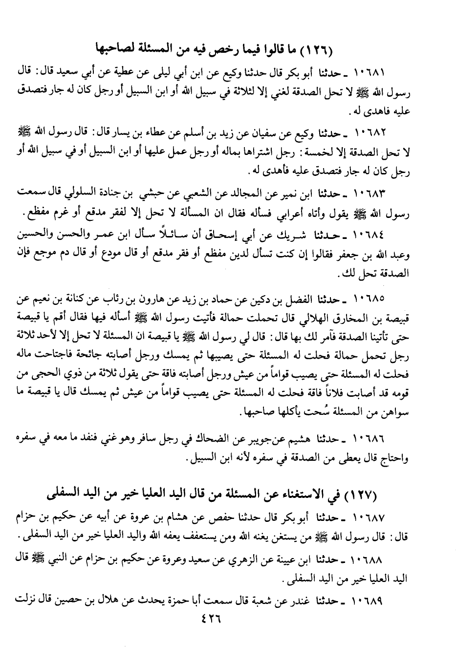 10684 - حَدَّثَنَا شَرِيكٌ، عَنْ أَبِي إِسْحَاقَ، أَنَّ سَائِلًا سَأَلَ ابْنَ عُمَرَ، وَالْحَسَنَ وَالْحُسَيْنَ وَعَبْدَ اللَّهِ بْنَ جَعْفَرٍ، فَقَالُوا: " §إِنْ كُنْتَ تَسْأَلُ لِدَيْنٍ مُفْظِعٍ، أَوْ فَقْرٍ مُدْقِعٍ، أَوْ قَالَ: مُودِعٍ، أَوْ قَالَ: دَمٍ مُوجِعٍ، فَإِنَّ الصَّدَقَةَ تَحِلُّ لَكَ "