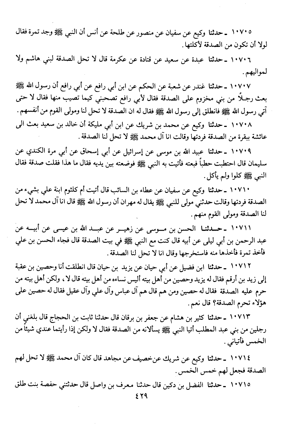 10715 - حَدَّثَنَا الْفَضْلُ بْنُ دُكَيْنٍ، قَالَ: حَدَّثَنَا مُصَرِّفُ بْنُ وَاصِلٍ، قَالَ: حَدَّثَتْنِي حَفْصَةُ بِنْتُ طَلْقٍ، قَالَتْ: حَدَّثَنِي جَدِّي رَشِيدُ بْنُ مَالِكٍ، عَنِ النَّبِيِّ صَلَّى اللهُ عَلَيْهِ وَسَلَّمَ، قَالَ: «§إِنَّا لَا تَحِلُّ لَنَا الصَّدَقَةُ»