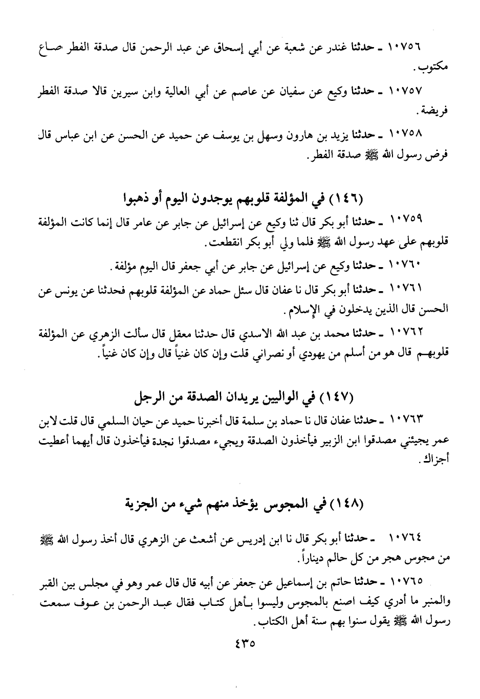 10761 - حَدَّثَنَا أَبُو بَكْرٍ قَالَ: نَا عَفَّانُ، قَالَ: سُئِلَ حَمَّادٌ عَنِ الْمُؤَلَّفَةِ قُلُوبُهُمْ فَحَدَّثَنَا، عَنْ يُونُسَ، عَنِ الْحَسَنِ، قَالَ: «§الَّذِينَ يَدْخُلُونَ فِي الْإِسْلَامِ»