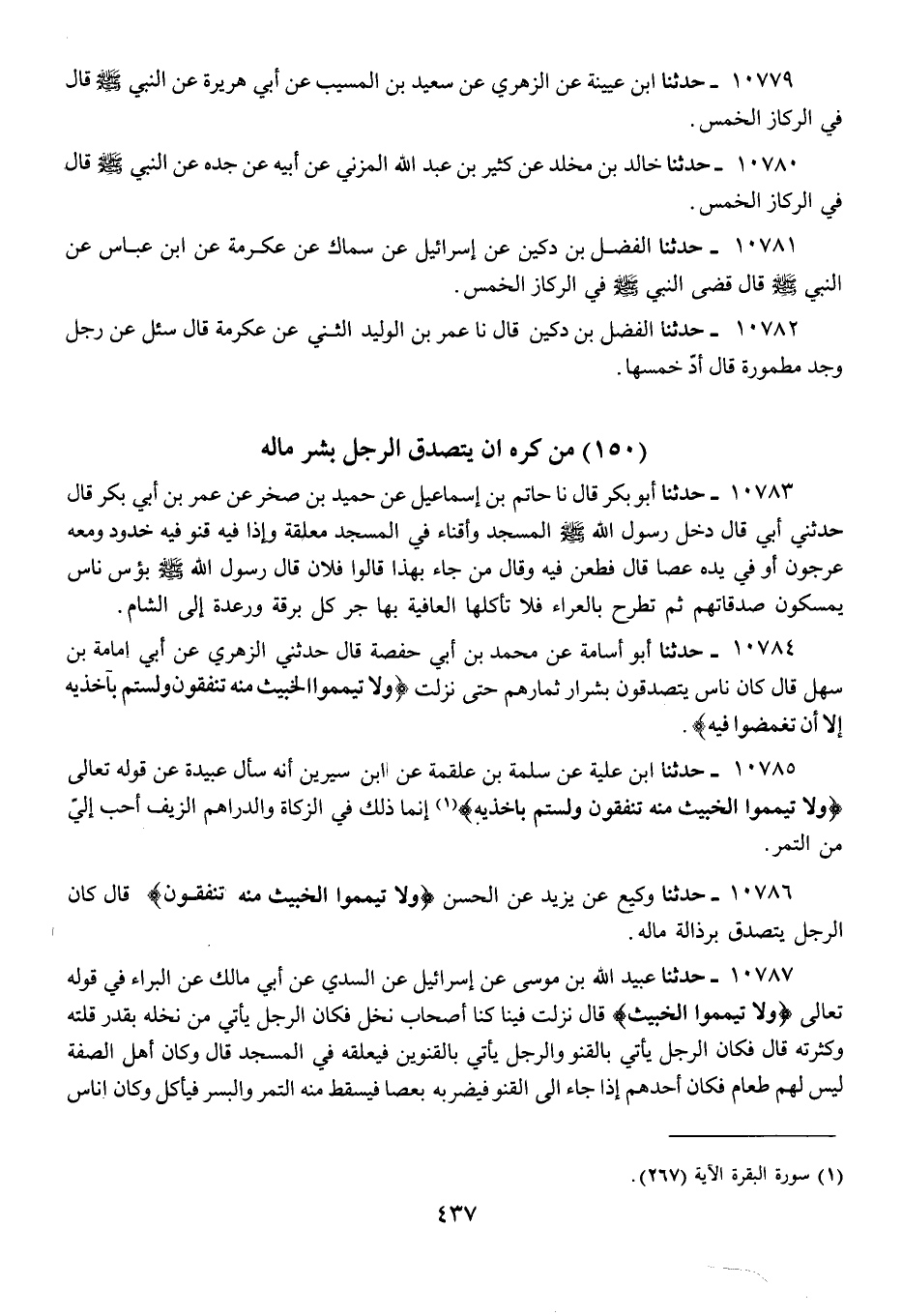 10784 - حَدَّثَنَا أَبُو أُسَامَةَ، عَنْ مُحَمَّدِ بْنِ أَبِي حَفْصَةَ، قَالَ: حَدَّثَنِي الزُّهْرِيُّ، عَنْ أَبِي أُمَامَةَ بْنِ سَهْلٍ، قَالَ: " كَانَ §نَاسٌ يَتَصَدَّقُونَ بِشِرَارِ ثِمَارِهِمْ، حَتَّى نَزَلَتْ {وَلَا تَيَمَّمُوا الْخَبِيثَ مِنْهُ تُنْفِقُونَ وَلَسْتُمْ بِآخِذِيهِ إِلَّا أَنْ تُغْمِضُوا فِيهِ} [البقرة: 267] "