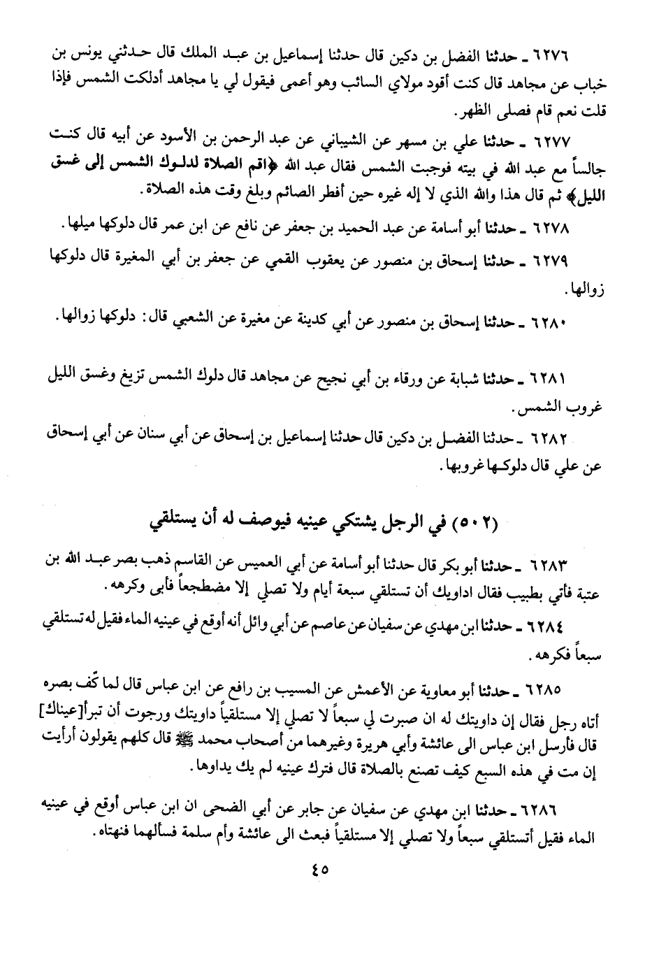 6284 - حَدَّثَنَا ابْنُ مَهْدِيٍّ، عَنْ سُفْيَانَ، عَنْ عَاصِمٍ، عَنْ أَبِي وَائِلٍ " أَنَّهُ فِي عَيْنَيْهِ الْمَاءُ، §فَقِيلَ لَهُ: تَسْتَلْقِي سَبْعًا، فَكَرِهَهُ "