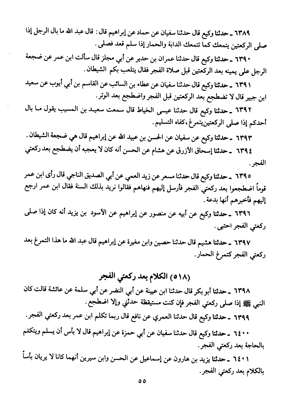 6395 - حَدَّثَنَا وَكِيعٌ، قَالَ: حَدَّثَنَا مِسْعَرٌ، عَنْ زَيْدٍ الْعَمِّيِّ، عَنْ أَبِي الصِّدِّيقِ النَّاجِي، قَالَ: §رَأَى ابْنُ عُمَرَ قَوْمًا اضْطَجَعُوا بَعْدَ رَكْعَتَيِ الْفَجْرِ، فَأَرْسَلَ إِلَيْهِمْ فَنَهَاهُمْ، فَقَالُوا: نُرِيدُ بِذَلِكَ السُّنَّةَ، فَقَالَ ابْنُ عُمَرَ: «ارْجِعْ إِلَيْهِمْ فَأَخْبِرْهُمْ أَنَّهَا بِدْعَةٌ»