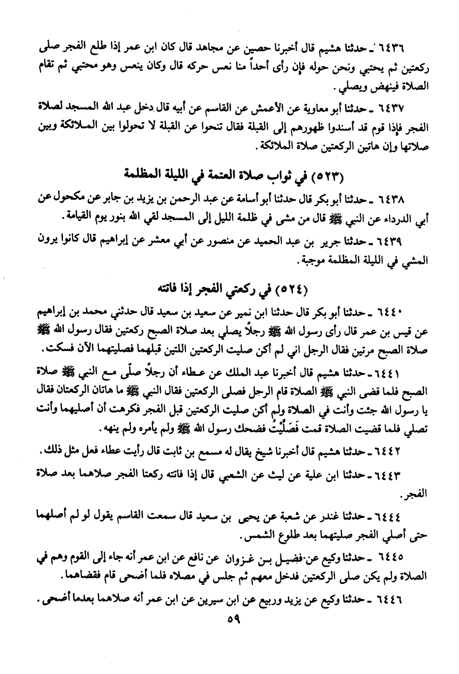 6436 - حَدَّثَنَا هُشَيْمٌ، قَالَ: أَخْبَرَنَا حُصَيْنٌ، عَنْ مُجَاهِدٍ، قَالَ: «كَانَ ابْنُ عُمَرَ §إِذَا طَلَعَ الْفَجْرُ صَلَّى رَكْعَتَيْنِ ثُمَّ يَحْتَبِي وَنَحْنُ حَوْلَهُ، فَإِنْ رَأَى أَحَدًا مِنَّا نَعَسَ حَرَّكَهُ» قَالَ: «وَكَانَ يَنْعَسُ وَهُوَ مُحْتَبِي، ثُمَّ تُقَامُ الصَّلَاةُ فَيَنْهَضُ وَيُصَلِّي»